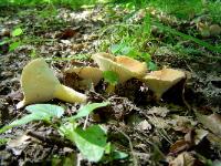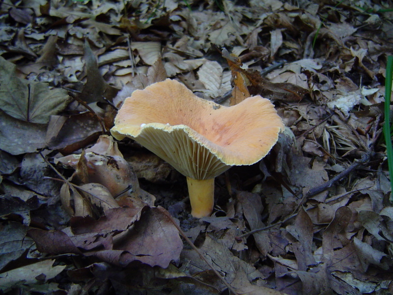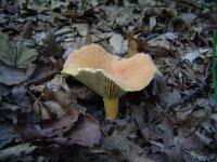 Formerly Lactarius hygrophoroides. Found growing from ground in hardwood forest; summer. Lactifluus hygrophoroides features a brownish orange cap that yellows with age. Gills are widely spaced. Milk and spore print are white. |