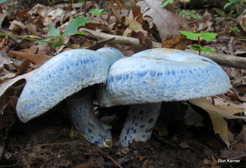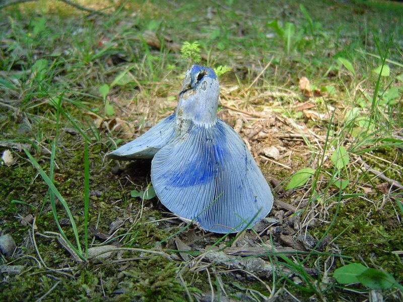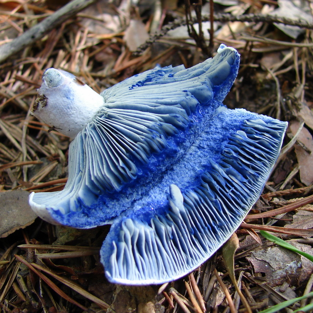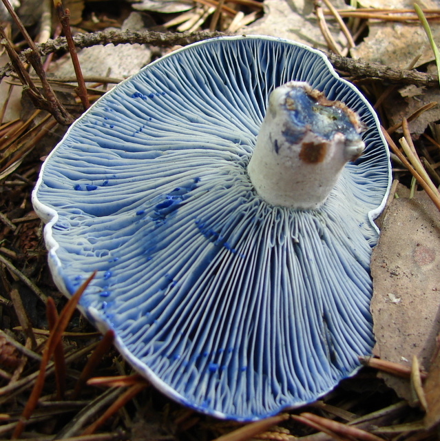 Blue cap, blue stem, blue gills, bruises blue and the milk is blue. Cream colored spore print. Concentric zones often, but not always, present on cap. Bruising and milk will slowly turn from blue to greenish. Commonly found during summer and fall in hardwood and conifer woods. |
