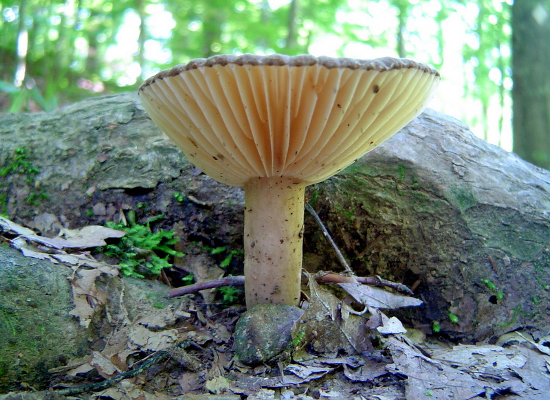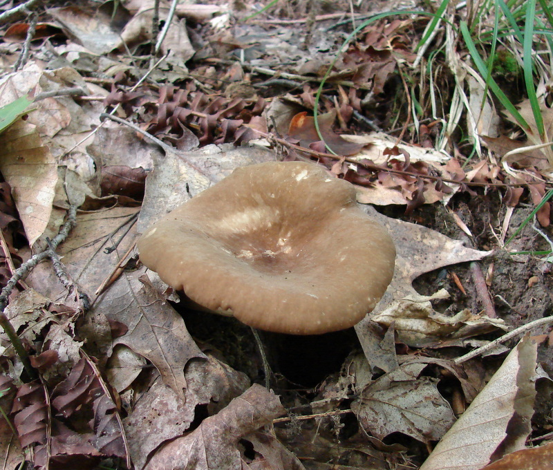 Cap is velvety and dark brown when young, margin scalloped. Gills attached to the stem and widely spaced, sometimes staining reddish. Milk white, sometimes changing to pinkish. Spore print is variable, described as white to orangish-yellow to pinkish buff. These two collections were found in a primarily hardwood forest with several Douglas Fir trees nearby, probably mychorrhizal with the firs. |