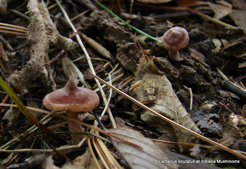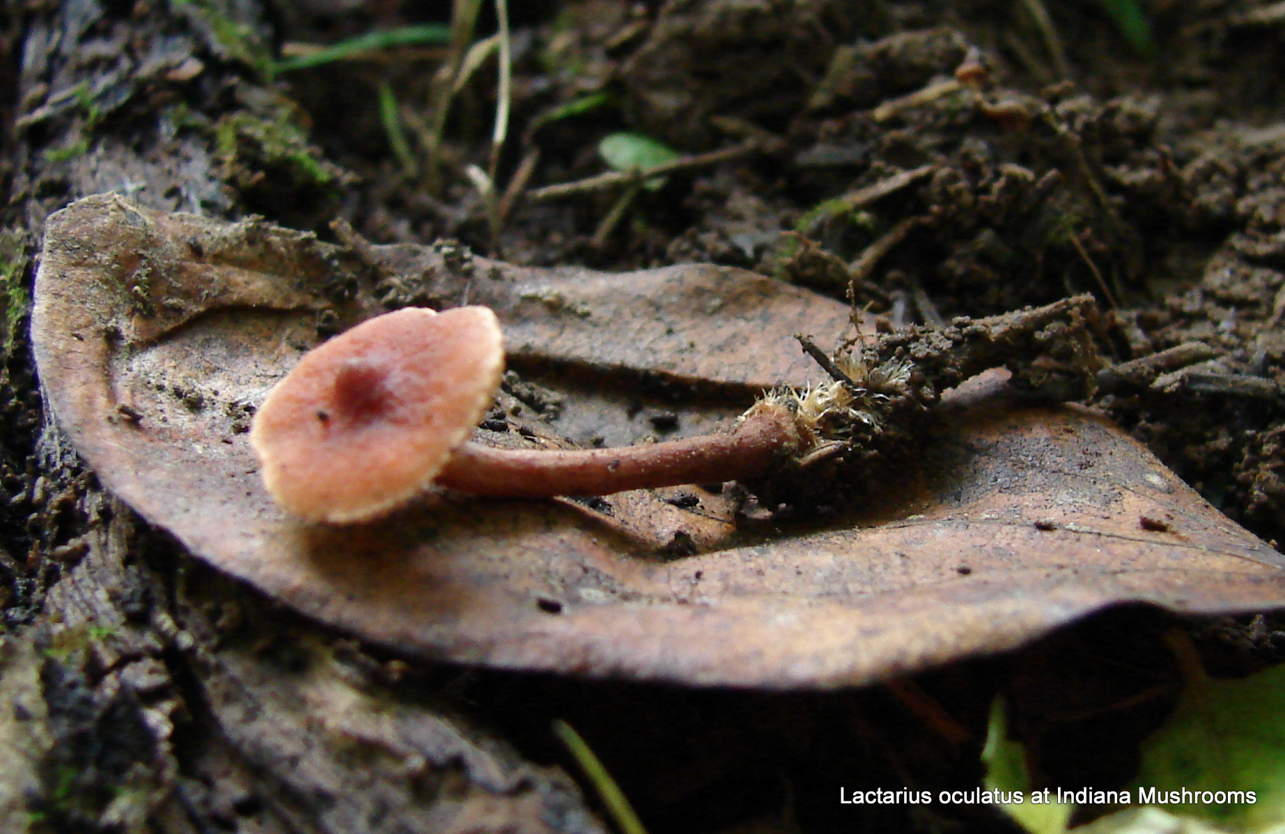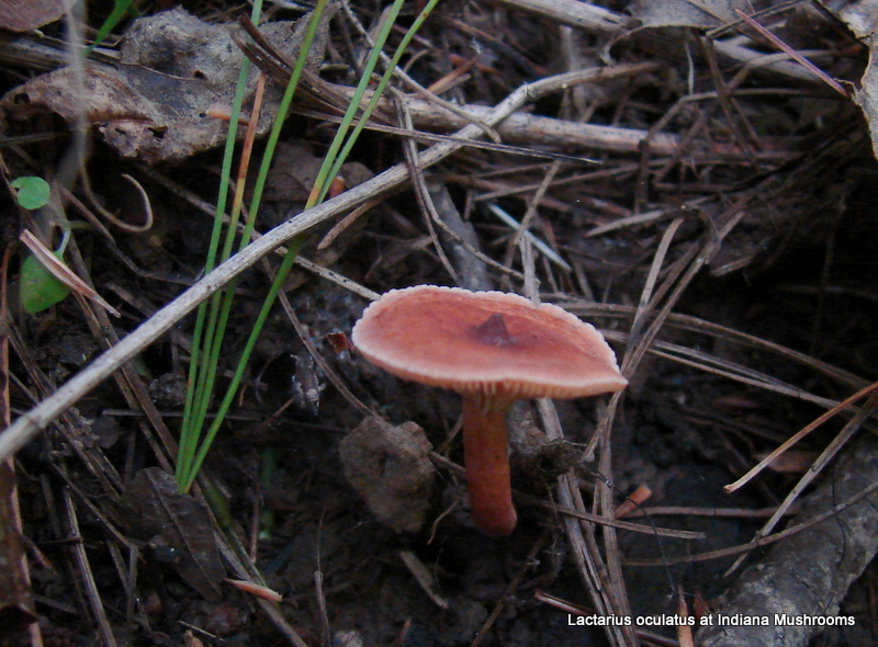 The Eye Spot Milky. Found late summer, early fall. This milk cap mushroom has several features that are not always apparent: the lined cap margin, zonate cap when young and absence of papilla (nipple) when cap becomes depressed, or sunken. |