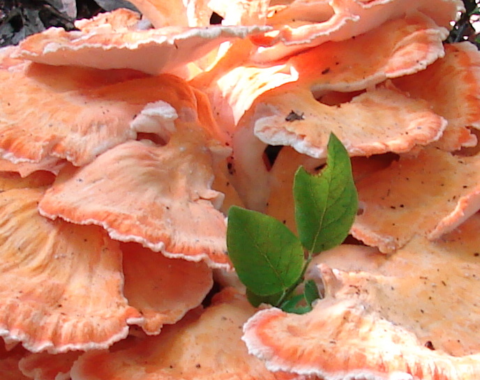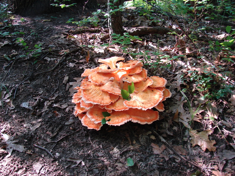 | The white pore surface and rosette growth formation of Laetiporus cincinnatus are helpful identifying characteristics. Although this mushroom seems to grow from the ground, it actually grows from buried oak tree roots. Found in Porter county; August. |