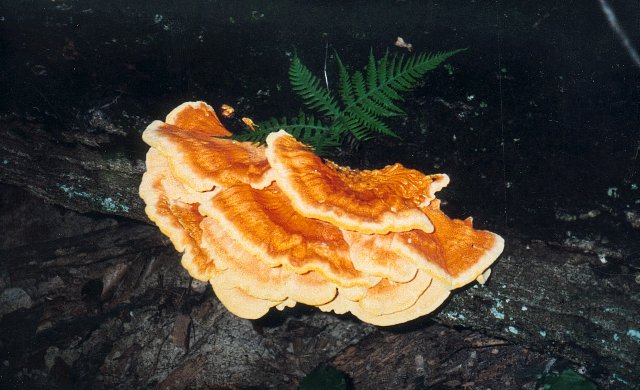 | Common names include Sulpher Shelf (because of color and growth habit) and Chicken Mushroom (because it taste like chicken). Sought out by many in the summer and fall. Pore surface yellow. Grows from wood. |