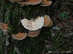 | The Gilled Polypore is a shelf mushroom that grows in a semi-circle from wood. The fuzzy cap has concentric rings of white and brown coloration. The orange coloration shown here is less common. |