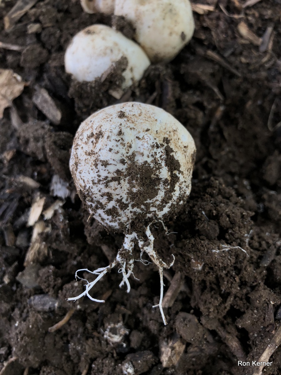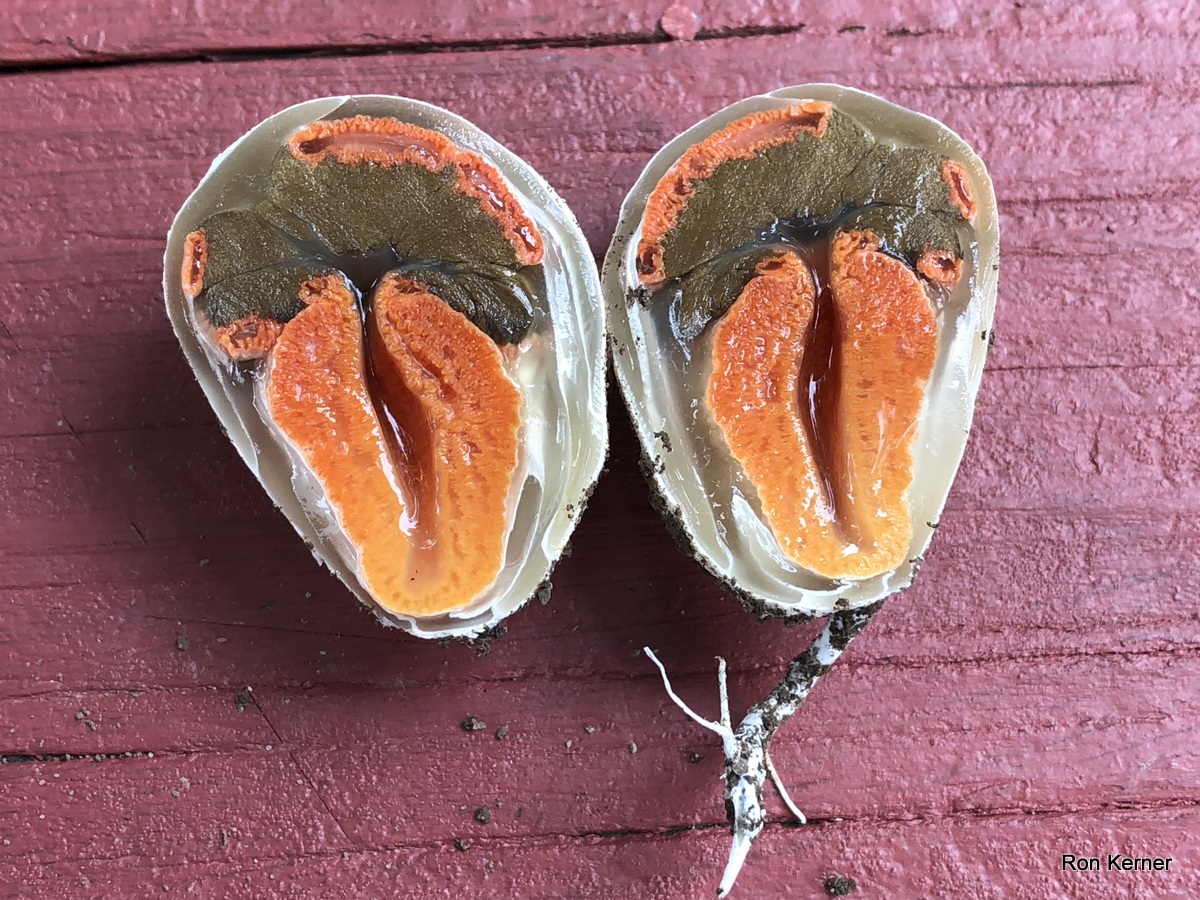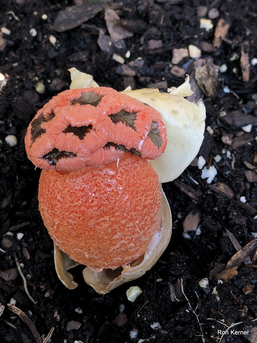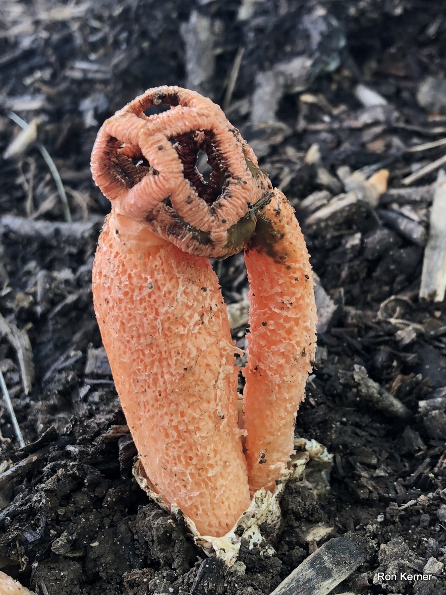 | This stinkhorn mushroom has been called Lysurus periphragmoides for ages and still is, but, evidently, it is not. See Lysurus species 01 at MushroomExpert.Com for the gory details. It is a fascinating fungus no matter the name. The collection pictured here was found in August growing from soil beneath a mulch bed. Weather conditions were extremely hot and humid after heavy summer rains. |