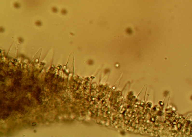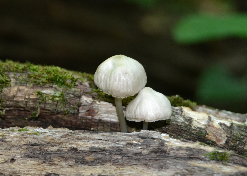 | These images of Mycena niveipes show the range of cap color from grayish to brownish to white. Cap 1.5-7 cm. Attached gills. This Mycena smells of chlorine bleach when the cap is crushed. |