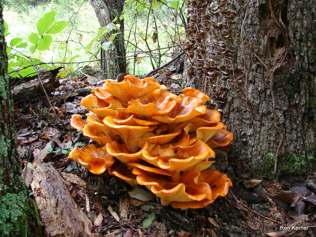 | The Jack O'Lantern mushroom. Summer/Fall. Grows in clusters from wood. Orange overall. Gills run down the stem. Base of stem tapered. Spore print white to creamy yellow. Poisonous. Gills have bioluminescent properties - they glow in the dark. |