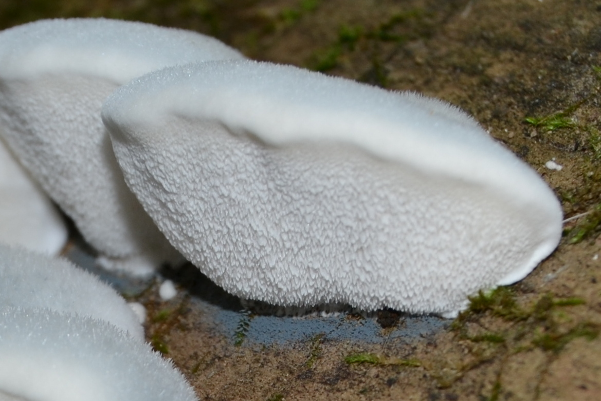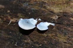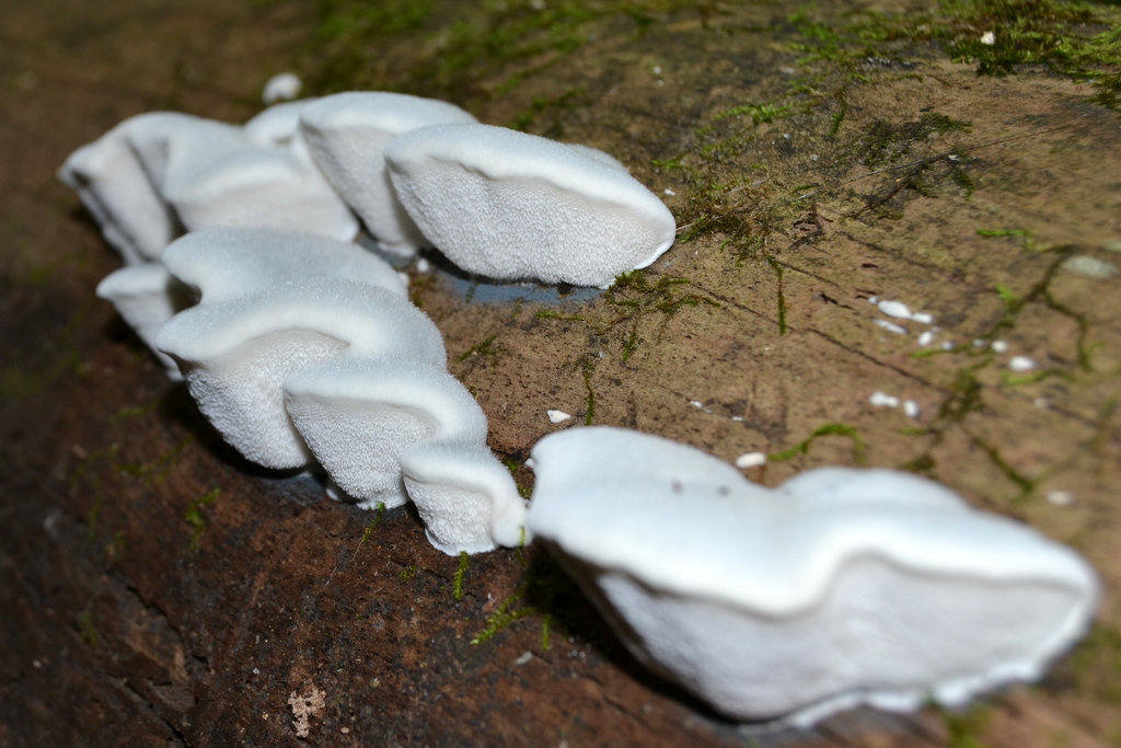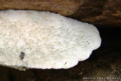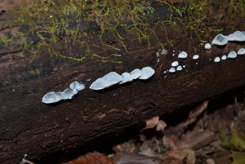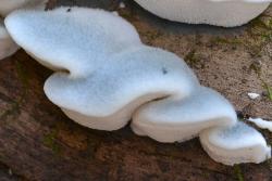 | Very young examples (2cm) of Postia caesia and its habit of formation along the side of a hardwood log, possibily sycamore. |