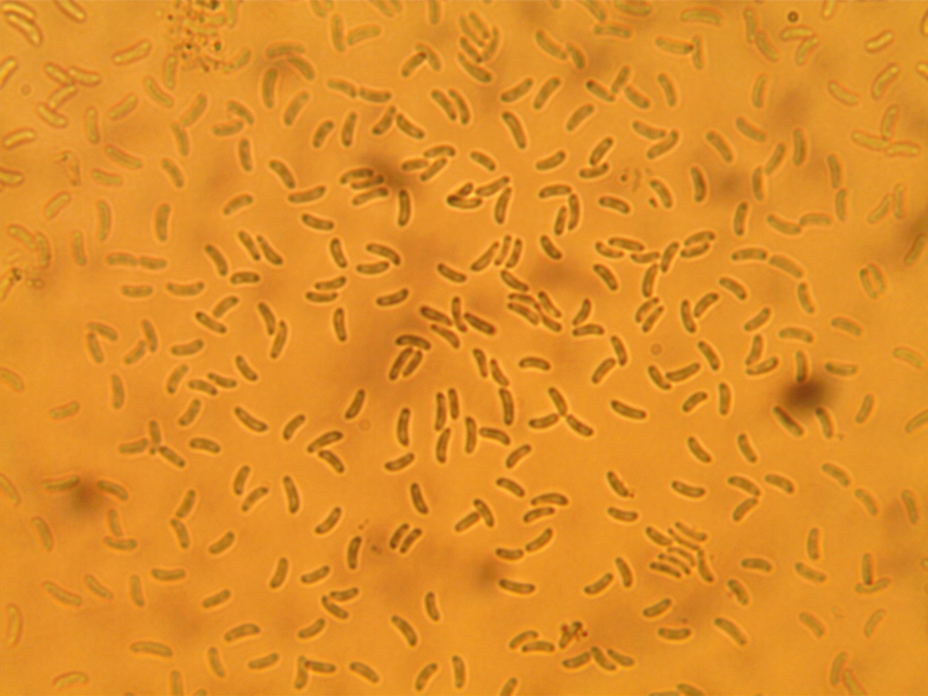 | The blue-gray spore deposit and sausage shaped spores (4-5 x 0.7-1µ) of Postia caesia. |