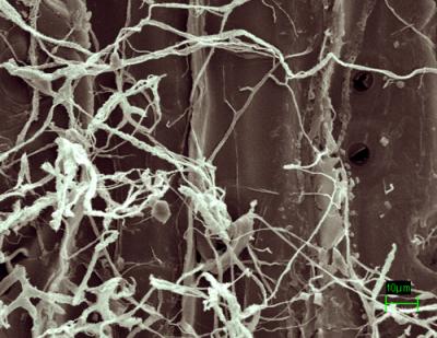 | The part of this fungus that "eats" the wood actually penatrates the wood to break down cellulose to consume the sugars (polysaccharides) it contains. Micrograph shows Postia placenta amongst wood cells. Image by Thomas Kuster, U.S. Department of Agriculture Forest Service, Forest Products Laboratory. |