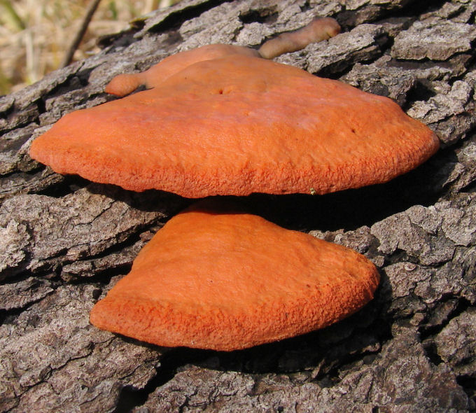 | Formerly Pycnoporus cinnabarinus. These examples were found growing from a cherry log. Dingy orange upper surface; pore surface saffron red. Largest shown 3.5 inches (9cm) across. Monroe county, Clear Creek Trail; March. |