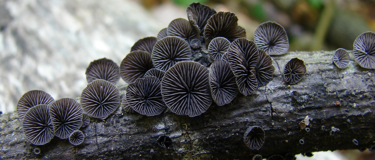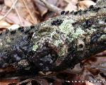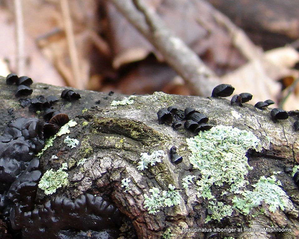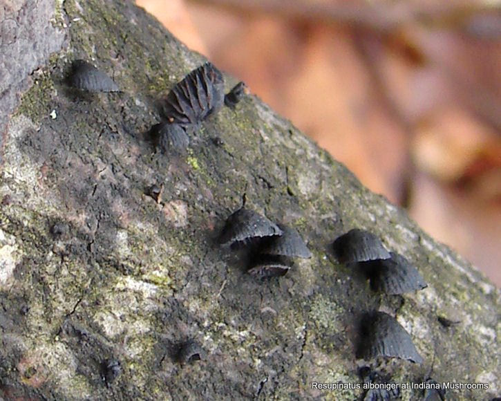 | The cap of this mushroom is measured in millimeters, with only the largest reaching the one centimeter mark. This gregarious fruiting of Resupinatus alboniger was found in January. A related species, Resupinatus applicatus, appears in common field guides; Resupinatus alboniger does not appear in any of them. (The jelly fungus, Exidia glandulosa, is also pictured.) |