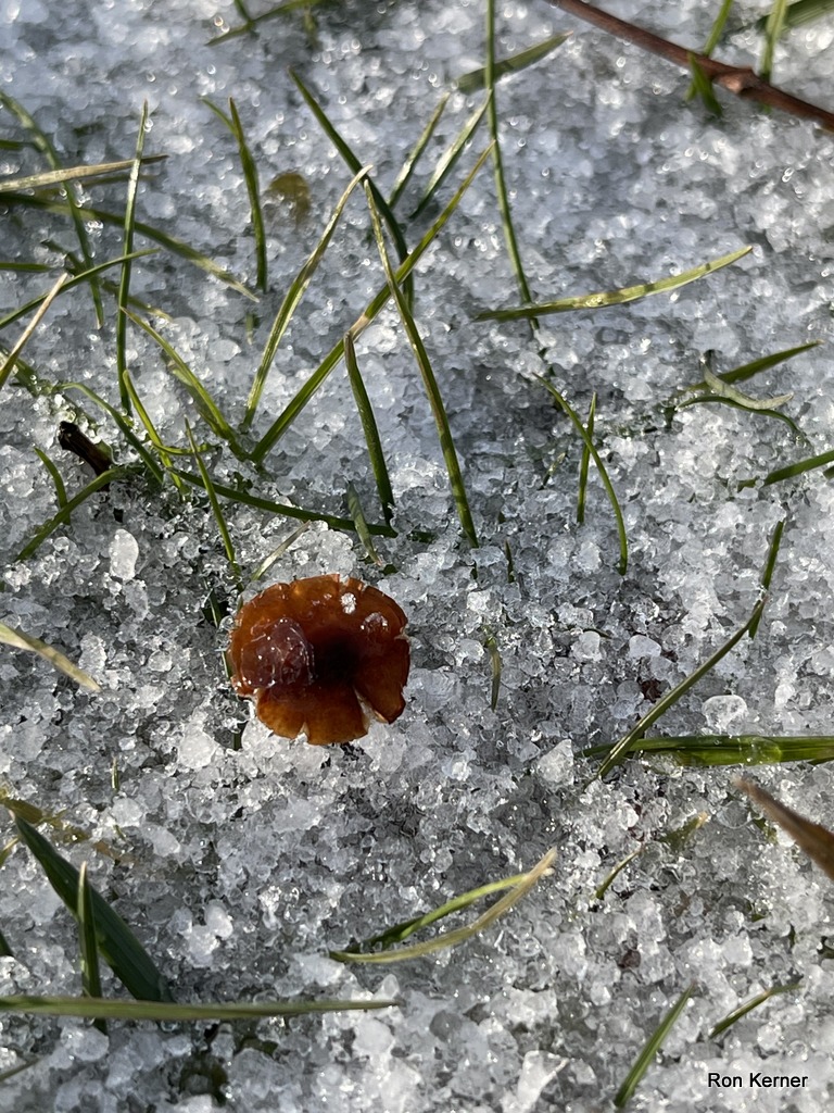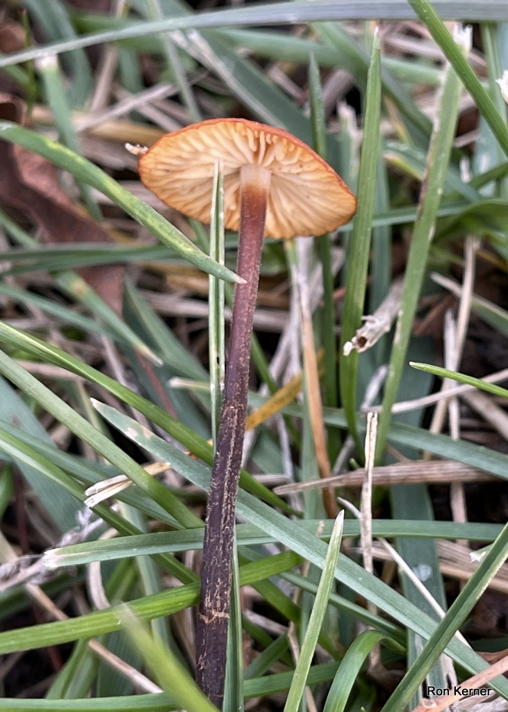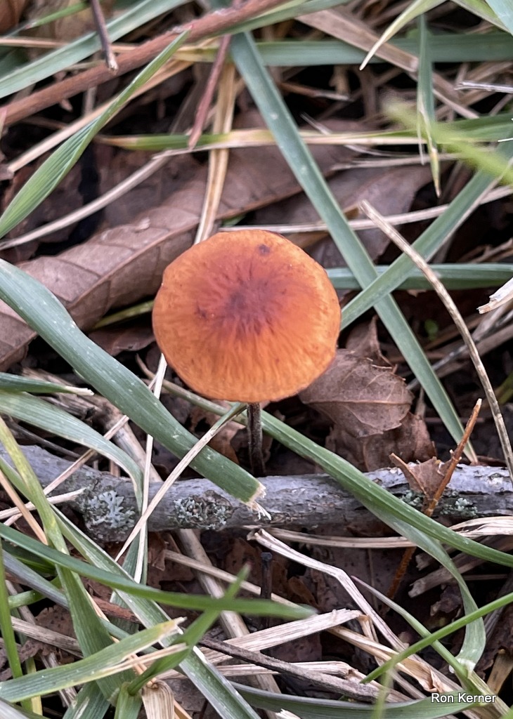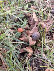 | The images above show specimens of Rhizomarasmius pyrrhocephalus growing gregariously from lawn in a city park under a pecan tree (Carya illinoinensis); winter. Seemed to be associated with decaying pecan shells. At least a hundred specimens of this mushroom appeared under this tree at one time in small groups. |