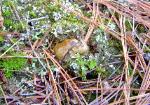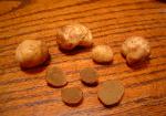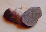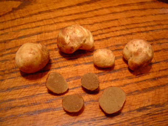 | This is a mature example (interior olive-brown) of Rhizopogon rubescens found in November; 4cm long. Outer skin bruises red. |