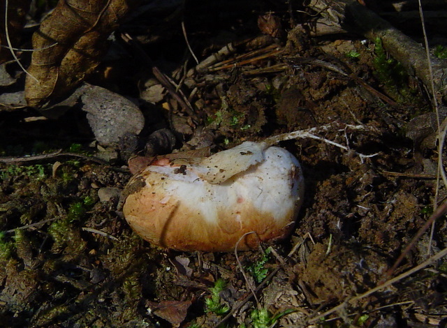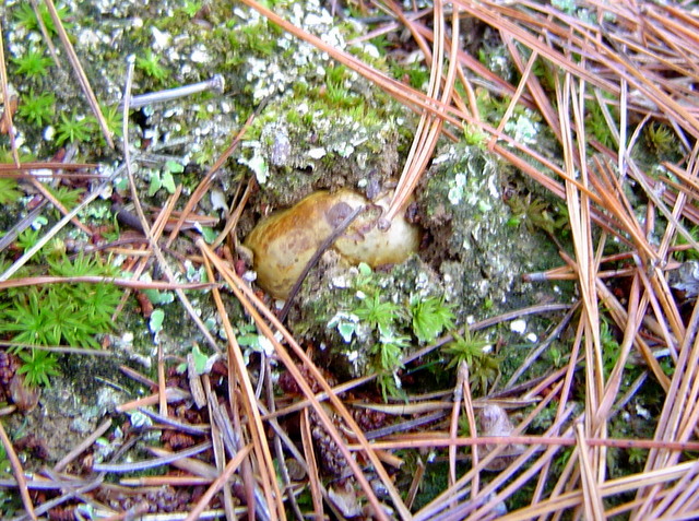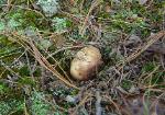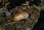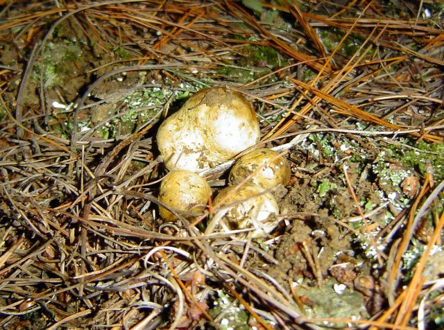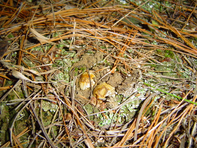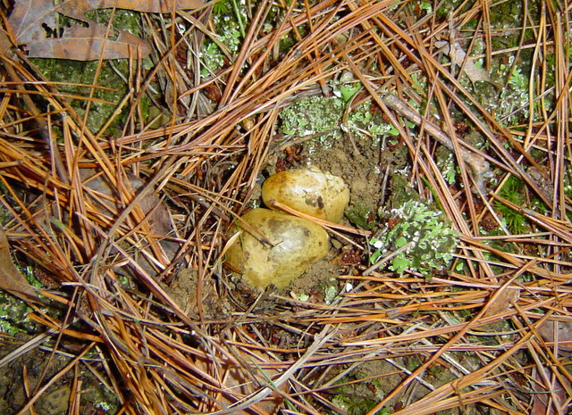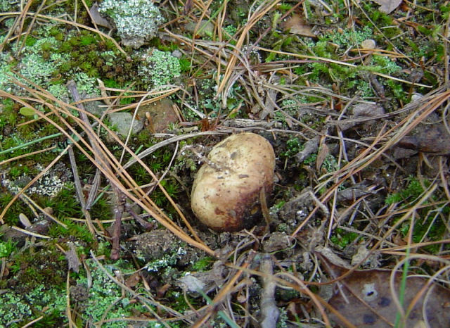 | Possibily a variant of Rhizopogon rubescens. This underground mushroom breaks through the soil surface as it matures. |