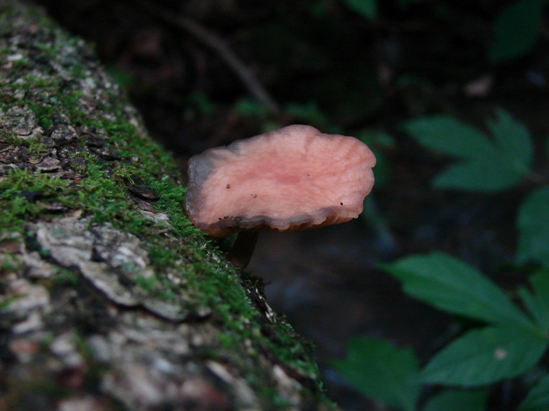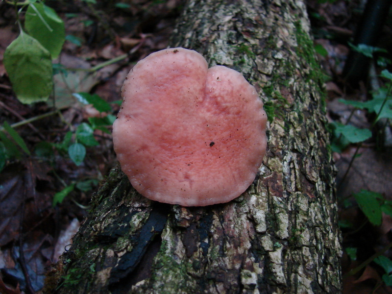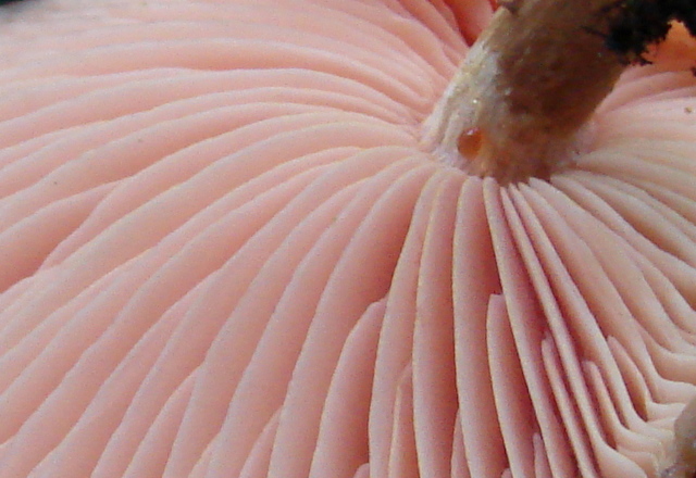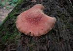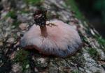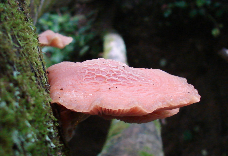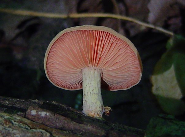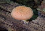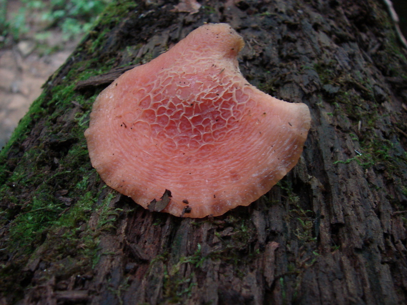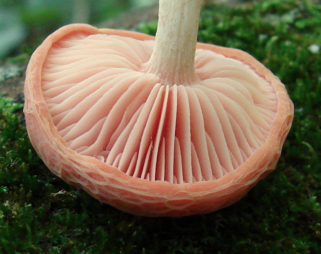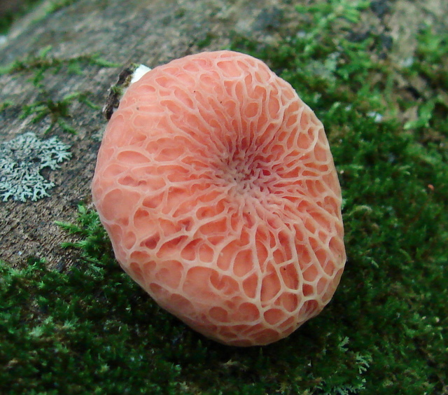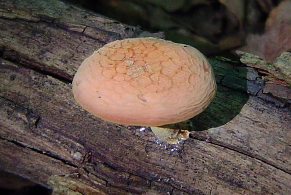 | The cap of Rhodotus palmatus does not always exhibit it's defining reticulated (netted) cap. Note pink droplet on stem. |
