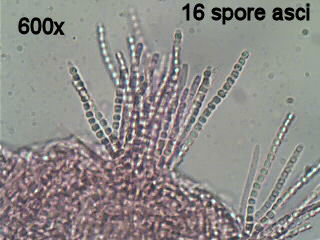 | Asci with spores. (Perithecia completely broken away during slide preparation.) |