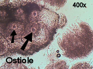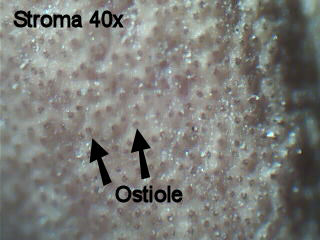 | Top views of stroma showing small pores (ostiole) where spores are released from the perithecia. |