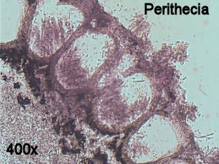 | Cross-section of stroma showing perithecia. Asci, the spore producing cells, develop within these walled chambers. |