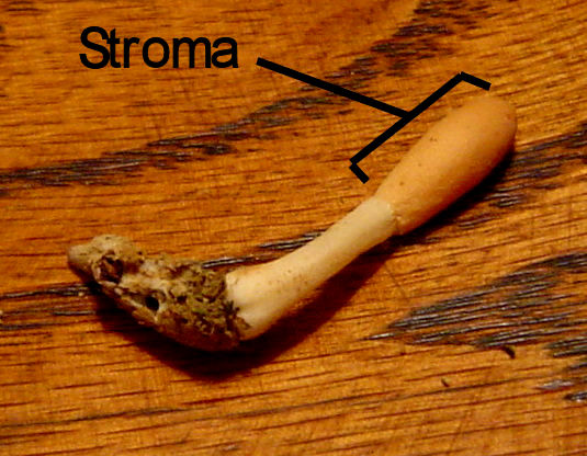 | Podostroma alutaceum and Hypocrea alutacea are synonyms. These fungi develop tiny fruiting bodies (perithecia) that are embedded in what George Barron calls "a massive fungus matrix", the stroma. |