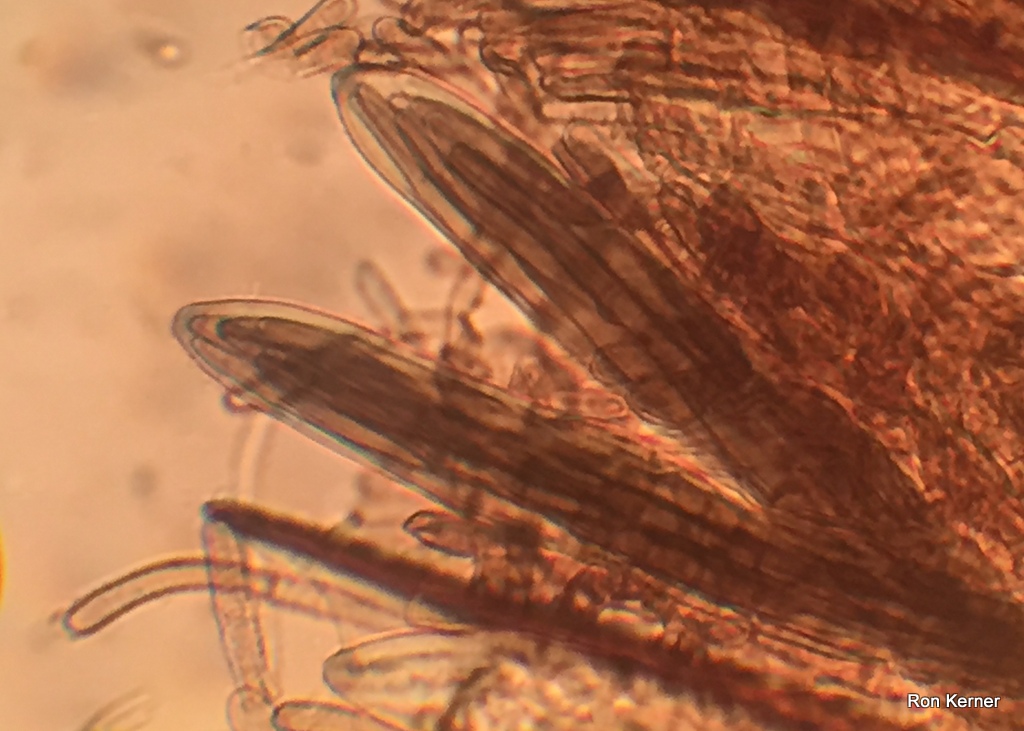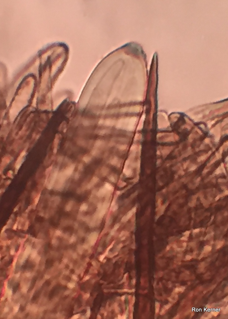 The dark brown and pointed structure is a single seta with a blue-tipped ascus beside it. |