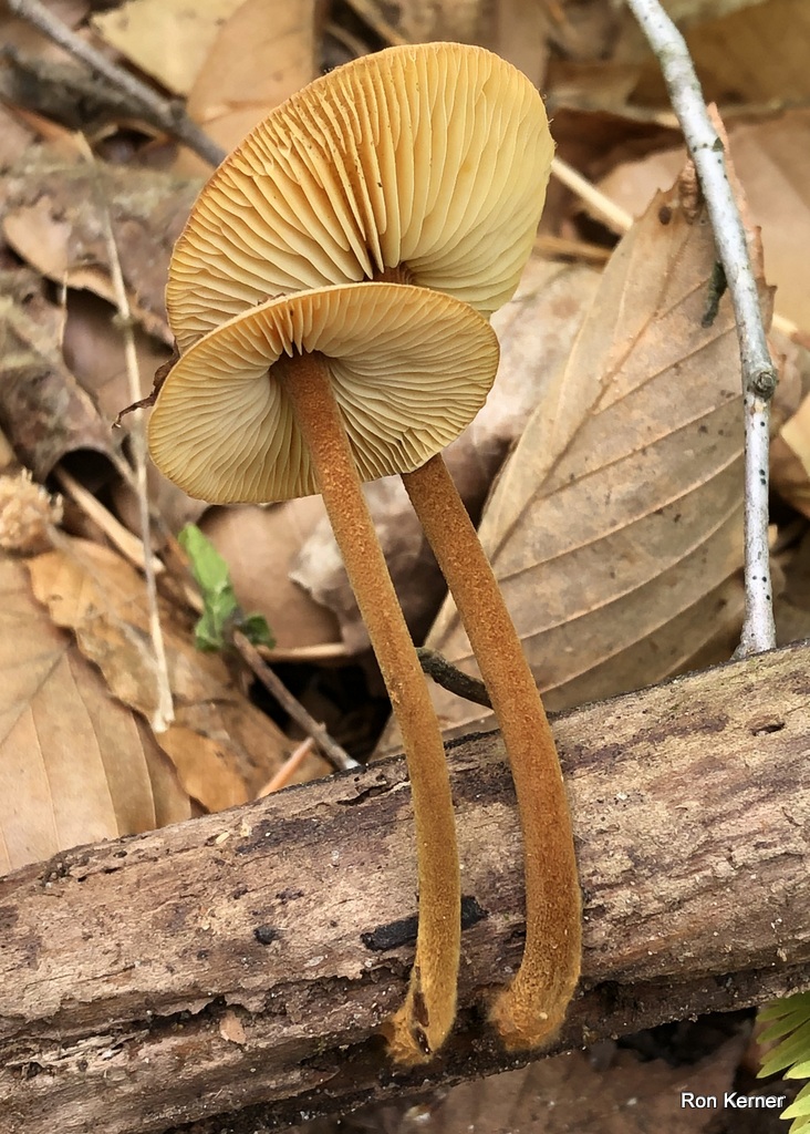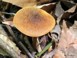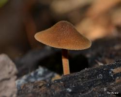 | These two collections were made in springtime. Largest cap 4cm wide. Grows from wood. Finely fuzzy on cap and stem when in its prime and dry. Brownish orange (rusty) cap coloration fades with age. White spore print. |