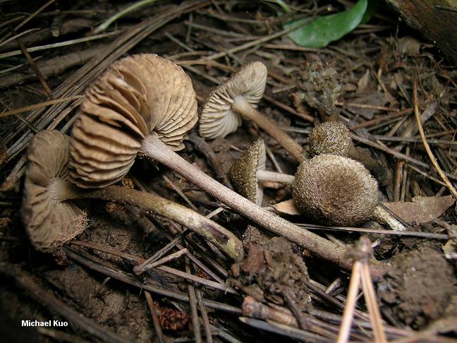 Inocybe leptophylla [Basidiomycetes > Agaricales > Cortinariaceae > Inocybe . . . ] by Michael Kuo The easiest way to identify this scaly brown Inocybe, as I learned from a group of inebriated mycologists and mycology graduate students last summer, is to rub the stem repeatedly, spill Irish whiskey on it, and convince yourself that it bruised blue . . . so that you can call it "Inocybe calamistrata" without putting it under the microscope, and pour some more drinks. The more difficult, time-consuming route is to dry some of the mushrooms and study them with a microscope months later on a sober winter evening--and to concede the possibility that sobriety was bruised, rather than the stem. Distinctive features for Inocybe leptophylla include the habitat under conifers (on the ground or on rotting wood); the scaly, brown cap; the non-bruising stem; the lack of a distinctive odor; the nodulose spores; and the lack of pleurocystidia. It is very close to Inocybe lanuginosa, which has scattered pleurocystidia and slightly smaller spores. Inocybe casimiri is a synonym. Inocybe leptophylla var. cystomarginata was originally described by Atkinson (1918), who thought it differed on the presence of cheilocystidia, but contemporary investigators (Matheny & Kropp, 2001) "do not consider var. cystomarginata as an autonomous taxon." Description: Ecology: Mycorrhizal with conifers (possibly at least facultatively saprobic?); growing alone, scattered, or gregariously around rotting conifer stumps; usually growing from rotting wood but also terrestrial under conifers; spring, summer, and fall; widely distributed in North America. Cap: 1-4 cm; convex or conical at first, becoming broadly bell-shaped, broadly convex, or nearly flat; dry; scaly; dark brown by all accounts save the original description, which describes the cap as brunneo vel umbrino frequenter purpureo tincto ("brown or dark brown frequently tinted purple"). Gills: Attached to the stem, sometimes by a notch; close; pale brownish, becoming cinnamon brown or medium brown; at first covered by a quickly disappearing cortina. Stem: 2-5 cm long; up to about .5 cm thick; more or less equal; dry; silky and pale above; brown and hairy to scaly below; solid. Flesh: Whitish; insubstantial. Odor: Not distinctive. Chemical Reactions: KOH on cap surface negative. Spore Print: Dull brown to cinnamon brown. Microscopic Features: Spores 9-12 x 7-9 µ; nodulose. Pleurocystidia absent. Cheilocystidia abundant; variously shaped; up to 60 µ long; hyaline in KOH. REFERENCES: Atkinson, 1918. (Atkinson, 1918; Kauffman, 1918; Kauffman, 1924; Stuntz, 1947; Stuntz, 1978; Grund & Stuntz, 1983; Matheny & Kropp, 2001.) Herb. Kuo 09220608. This website contains no information about the edibility or toxicity of mushrooms. |