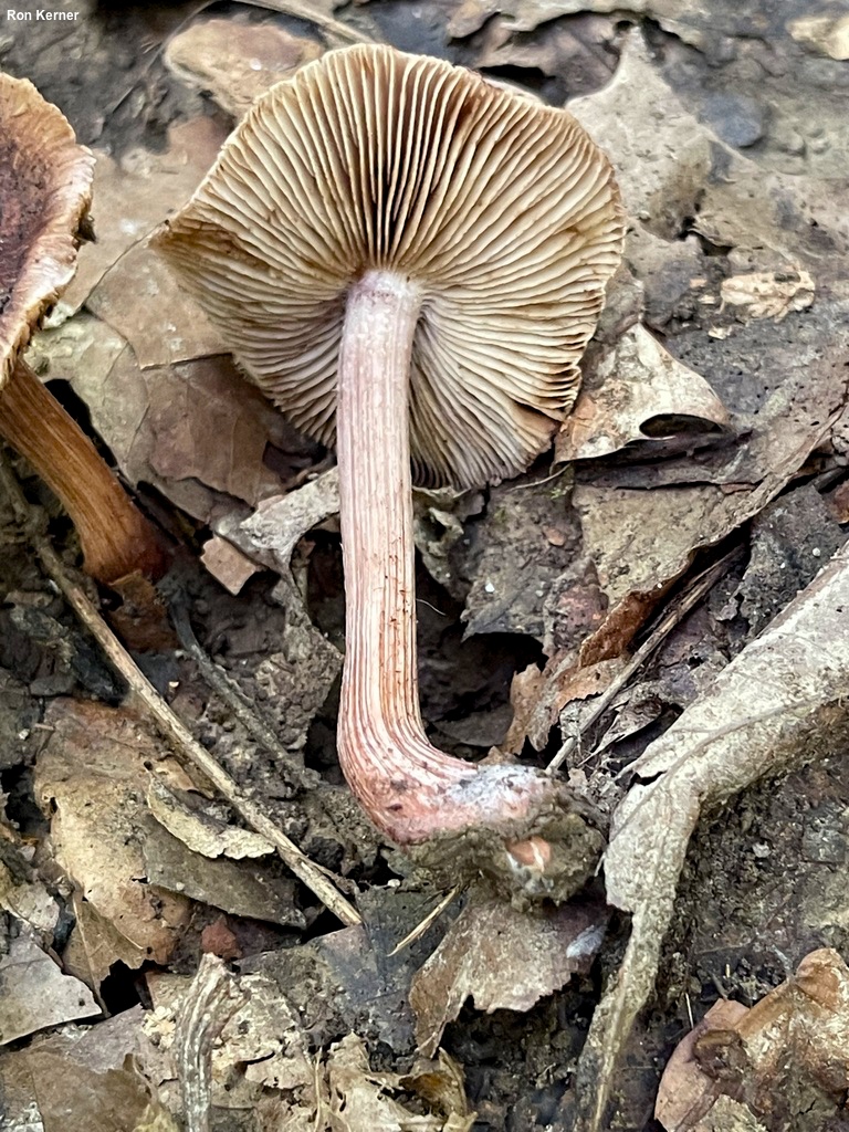 [Basidiomycota > Agaricales > Inocybaceae > Inocybe . . . ] Inocybe vinaceobrunnea by Michael Kuo, 12 February 2024 Inocybe vinaceobrunnea is a denizen of hardwood and mixed hardwood-conifer forests east of the Rocky Mountains, tentatively recognized by its purple-brown colors, radially fibrillose cap surface, pinkish staining stem, and spermatic-sweet odor. Microscopic features should be verified for more confident identification, including smooth and ellipsoid spores, cheilocystidia but not pleurocystidia, and a pileipellis that is pinkish to reddish in KOH. Traditionally North American authors have used the names Inocybe jurana and Inocybe adaequata for the mushroom featured here, but Matheny & Kudzma (2019) found phylogenetic differences among collections worldwide, concluding that "[a]t least four species can now be recognized in the Adaequata clade: European I. adaequata, Eurasian I. rhodolia, eastern North American I. vinaceobrunnea . . . and what likely represents an undescribed western North American species" (223). "Inosperma vinaceobrunneum" is another combination for this mushroom, but the name was published in an online setting without editing, peer review, or even a shred of offered support (also the publication contains typos and incorrectly cites the original authors of the species); see this page for more discussion. Thanks to Ron Kerner for collecting, documenting, and preserving Inocybe vinaceobrunnea; his collection is deposited in The Herbarium of Michael Kuo. Description: Ecology: Mycorrhizal; growing alone, scattered, or gregariously in association with hardwoods; originally described from Tennessee (Matheny & Kudzma 2019); widely distributed in the United States east of the Rocky Mountains. The illustrated and described collections are from Illinois, Indiana, and Kentucky. Cap: 2–6 cm; conic at first, becoming broadly conic to broadly bell-shaped or plano-depressed, but retaining a central bump; dry; radially fibrillose; purplish brown, with a darker brown center; the margin at first somewhat inrolled. Gills: Narrowly attached to the stem; close; short-gills frequent; whitish at first, becoming pale brown, then medium snuff brown; edges whitish. Stem: 4–6 cm long; 0.5–1.5 cm thick; more or less equal above a slightly swollen base; dry; fibrillose with reddish fibrils; ground color whitish above and pinkish below; bruising and discoloring purplish pink. Flesh: Whitish; pinkish to pink in the stem when sliced. Odor: When fresh, sweet with a spermatic component; when dried specimens are rehydrated, strongly spermatic. Chemical Reactions: KOH red to dark purplish red on cap surface. Spore Print: Dull brown. Microscopic Features: Spores 10–14 x 5–6.5 µm; ellipsoid, sometimes with one side somewhat flattened; smooth; walls about 0.5 µm thick; yellowish and often uniguttulate in KOH. Basidia 28–32 x 8–10 µm; clavate; 4-sterigmate. Pleurocystidia not found. Cheilocystidia 30–60 x 6–10 µm; cylindric-flexuous with subclavate, clavate, or merely rounded apices—or occasionally larger and saccate—smooth; thin-walled; hyaline to brown in KOH. Pileipellis a cutis; elements 4–10 µm wide, smooth or finely roughened, dull red in KOH; clamp connections present. REFERENCES: Matheny, Ovrebo & Kudzma, 2019. (Kauffman, 1918; Kauffman, 1924; Arora, 1986; Phillips, 1991/2005; Kuo & Methven, 2014; Matheny, 2018; Matheny & Kudzma, 2019; Matheny et al., 2020.) Herb. Kuo 10010404, 08071301, 08271401, 08122201. This site contains no information about the edibility or toxicity of mushrooms. |