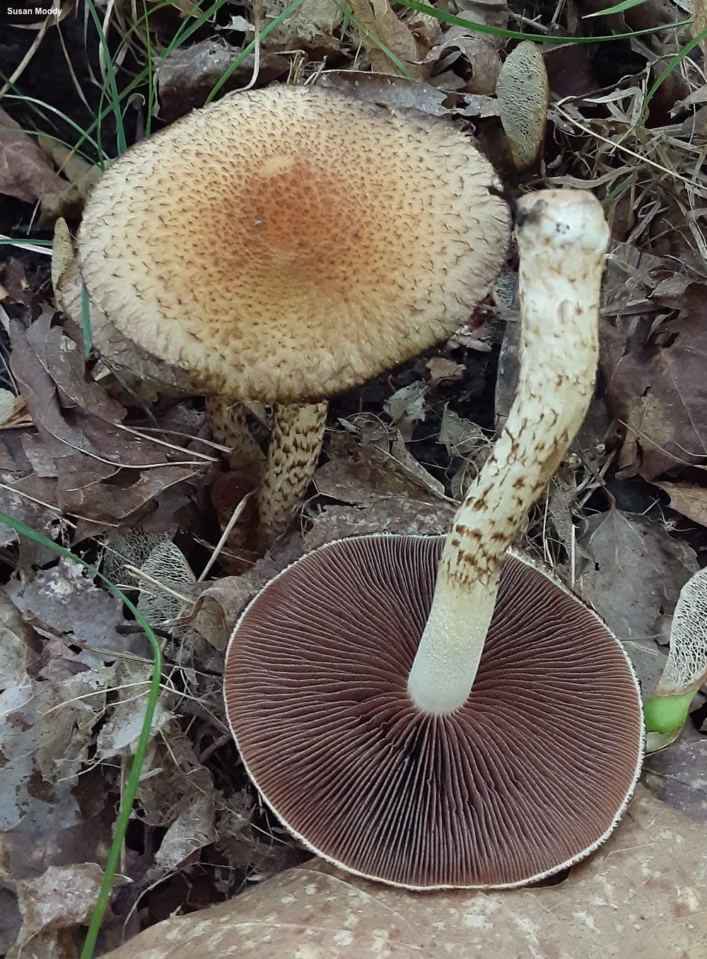 Lacrymaria echiniceps [ Basidiomycota > Agaricales > Psathyrellaceae > Lacrymaria . . . ] by Michael Kuo Lacrymaria echiniceps is a woodland species found in the United States from the Great Plains eastward, featuring a cap and stem covered with brown scales and fibrils. The gills are attached to the stem, and become brown—almost purplish brown—with maturity; their edges are whitish and contrasting as a result of abundant microscopic cheilocystidia forming a sterile zone. Similar mushrooms include Lacrymaria velutina, which is more likely to be found in grassy places than in woods and features a bald stem and larger spores—and various brown-spored species from Pholiota, Inocybe, and elsewhere; microscopic examination may be required to identify Lacrymaria echiniceps with confidence. I would love to see a tiny "button" of this species some day, since it must be fuzzy, brown, and super cute; the scales and fibrils on the cap and stem of developing specimens result from a form of universal veil—a protective covering that covers the young mushroom and gets stretched out with development. Psathyrella echiniceps is a former name. Thanks to Susan Moody for collecting, documenting, and preserving Lacrymaria echiniceps for study; her collection is deposited in The Herbarium of Michael Kuo. Description: Ecology: Saprobic; growing on the ground alone, gregariously, or in groups in hardwood or conifer forests; summer through fall; originally described from New York; fairly widely distributed in the northeastern, mid-Atlantic, and Midwestern United States and adjacent Canada. The illustrated and described collections are from Illinois and Minnesota. Cap: 3–6 cm; convex to bell shaped, becoming broadly convex, broadly bell-shaped, or nearly flat; dry; dull yellowish to dull brownish orangish under medium brown, fibrillose scales. Gills: Broadly attached to the stem; close; short-gills frequent; pale brownish at first, becoming medium brown with a hint of purple; with whitish, contrasting edges; faces mottled at maturity. Stem: 4–7 cm long; 6–10 mm thick; equal; whitish and mealy at the apex, but elsewhere whitish underneath brown fibrils and scales; basal mycelium white. Flesh: Whitish to watery brownish; unchanging when sliced. Odor: Not distinctive. Spore Print: Dark purplish brown. Microscopic Features: Spores 7–9 x 4–5 µm; ellipsoid to subamygdaliform, with a small pore; smooth; brown in KOH. Basidia 18–20 x 5–6 µm; abruptly clavate; 4-sterigmate. Cheilocystidia abundant, in a sterile zone; 55–75 x 5–7.5 µm; cylindric-flexuous, with clavate to subclavate or subcapitate apices; smooth; thin-walled; hyaline in KOH. Pleurocystidia 30–40 x 7.5–10 µm; more or less utriform; smooth; thin-walled; hyaline; scattered; sometimes grouped in twos or threes. Pileipellis a hymeniform layer of yellowish pyriform elements 20–50 µm wide, from which arise bundles of cylindric, brown, clamped elements 5–12.5 µm wide, with smooth or encrusted walls. REFERENCES: (G. F. Atkinson, 1909) P. Voto, 2019. (Murrill, 1922; Smith, 1972; Smith, Smith & Weber, 1979; McNeil, 2006; Padamsee et al., 2008; Sturgeon, 2018.) Herb. Kuo 08202004. This site contains no information about the edibility or toxicity of mushrooms. |