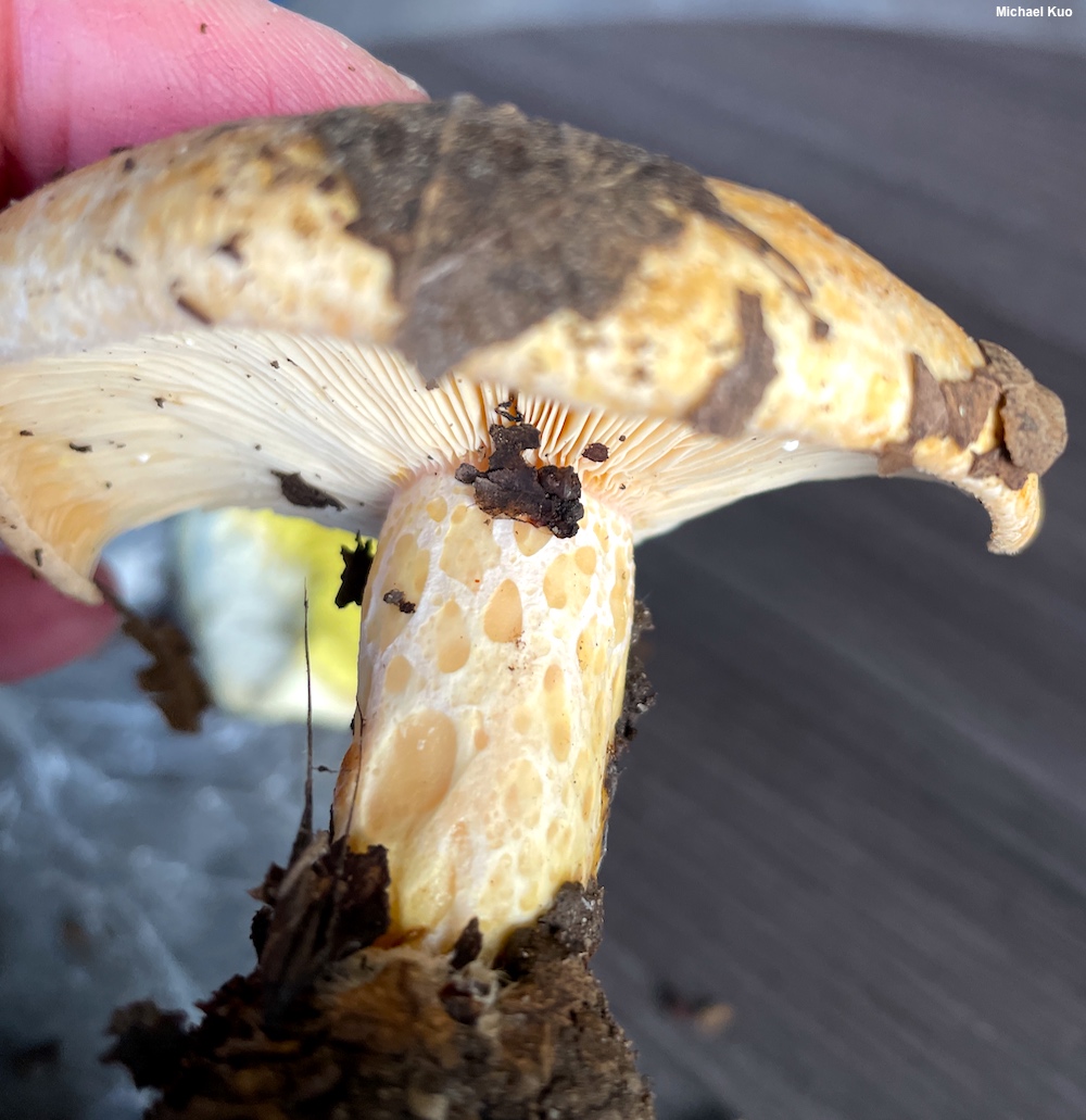 Stem: 2–5 cm long; 1–1.5 cm thick; equal; with shallow, yellowish to brownish potholes (but see comments above regarding variability); colored like the cap; hollowing with age; basal mycelium white.