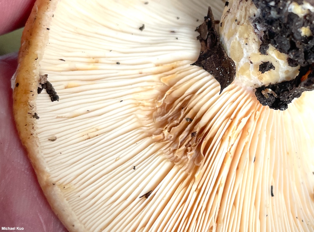 Gills: Beginning to run down the stem; close; short-gills frequent; whitish, stained slowly brownish by the milk.