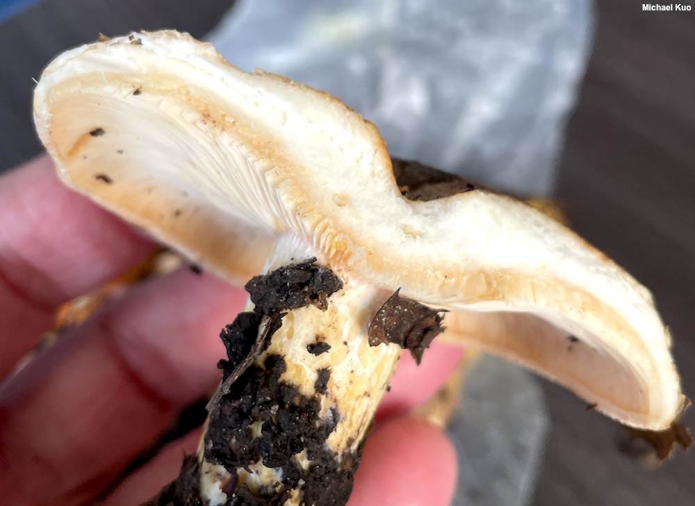 Flesh: Whitish; firm; stained slowly yellowish to orangish when sliced.
