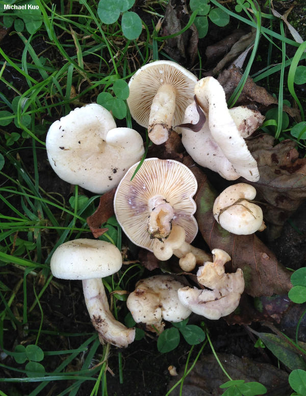 Lactarius aspideus [ Basidiomycota > Russulales > Russulaceae > Lactarius . . . ] by Michael Kuo One of many purple-staining milky caps, Lactarius aspideus can be recognized by its pale, whitish to yellowish colors and its association with European willows. It is reported to prefer wet, grassy areas, often near lakes (Heilmann-Clausen et al., 2000), and my collection, illustrated and described here, was made in just such a location in Italy's lake district. Similar European species can be separated on the basis of their mycorrhizal associations: Lactarius flavidus, in oak-beech-hornbeam ecosystems; and Lactarius salicis-herbaceae and Lactarius salicis-reticulatae, under dwarf willows in arctic and alpine ecosystems (the latter with reticulate spores). The name Lactarius aspideus has been applied in a few North American contexts (e.g. Smith, 1975), but the species probably does not occur on our continent. Lactarius aspideoides is a North American species first described from "a grassy place in hillside sheep-pasture near small fir trees" in Windham County, Vermont (Burlingham, 1907); its morphology is very similar, but it features a sticky stem surface and a bitter taste. Later North American authors have used the name aspideoides to apply to various morphologically similar collections across the continent, paying almost no attention whatsoever to the mycorrhizal tree associations and vastly different ecosystems; in short, contemporary study of this group, based on molecular and ecological data, will be required before any names can be applied with confidence. Description: Ecology: Mycorrhizal with willows, often in wet, grassy areas; growing alone, scattered, or gregariously; summer and fall; widely distributed in Europe, but not common. The illustrated and described collection is from Italy. Cap: 2.5–5 cm; convex at first, becoming more or less flat, or shallowly depressed; sticky when fresh but soon dry; bald; whitish to pale yellowish; not zoned; the margin not lined. Gills: Broadly attached to the stem or beginning to run down it; close; short-gills frequent; whitish to yellowish; stained lilac purple by the milk. Stem: 2–3 cm long; 0.5–1 cm thick; equal, or slightly tapered to the base; without potholes; bald; whitish to yellowish; staining lilac purple; fragile; hollowing. Flesh: Whitish; staining lilac when sliced. Milk: White; fairly copious; unchanging when exposed to air; staining tissues lilac purple. Odor and Taste: Not distinctive. Spore Print: Undocumented by me; reported as "pale cream" by Heilmann-Clausen et al. (2000). Microscopic Features: Spores 7–8 x 6–7 µm; broadly ellipsoid or subglobose; ornamented with amyloid warts and ridges extending 0.5–1 µm high; connectors fairly frequent, forming partial reticula. Macrocystidia narrowly fusiform; to about 65 x 10 µm. Pileipellis an ixocutis; elements 2.5–5 µm wide. REFERENCES: (Fries, 1818) Fries 1838. (Fries, 1821; Saccardo, 1887; Burlingham, 1907; Smith, 1975; Hesler & Smith, 1979; Phillips, 1981; Heilmann-Clausen et al., 2000; Kränzlin, 2005; Verbeken & Vesterholt, 2008.) Herb. Kuo 10161404. This site contains no information about the edibility or toxicity of mushrooms. |