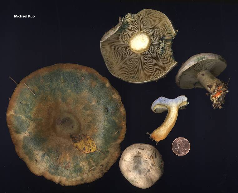 Lactarius chelidonium var. chelidonioides [ Agaricomycetes > Russulales > Russulaceae > Lactarius . . . ] by Michael Kuo Growing under pines in eastern North America, this funky mushroom seems almost like a cross between Lactarius indigo and Lactarius deliciosus. With Lactarius indigo it shares the gorgeous blue color of the exposed flesh--and when very young, its cap is often a pale bluish shade. As Lactarius chelidonium var. chelidonioides begins to mature, however, its cap goes through a series of bewildering color changes--from a dingy yellowish brown to a dull orange, bruising and discoloring strongly dark green. When orangish and bruising green, it is reminiscent of Lactarius deliciosus. Eventually, in older specimens, the cap may become dark green overall. Description: Ecology: Mycorrhizal with pines, especially eastern white pine and red pine in young plantations; September, October, and November; distribution uncertain but probably fairly widely distributed in eastern North America. Cap: 3-12 cm; convex becoming planoconvex to shallowly depressed or shallowly vase-shaped; sticky when fresh, but soon dry; bald or very finely appressed-fibrillose; often finely roughened; dirty bluish when young, passing through stages of yellowish brown and dull orange; often mottled with watery spots of color; readily bruising dark green; in age often green overall; without concentric zones of color, or with faint zones near the margin. Gills: Beginning to run down the stem; close or fairly crowded; pale yellowish when young, becoming dirty yellowish to dull orange or brownish; bruising and discoloring green. Stem: 2-6 cm long; 1-3 cm thick; tough; more or less equal; dry; fairly smooth; without potholes; colored like the cap or paler. Flesh: Sky blue in the cap; paler elsewhere; sometimes orange in the stem, especially at the base and near the cortex. Milk: Very scant (likely to be observed only in very young buttons); dirty yellowish to yellowish brown; staining tissues green; staining white paper yellowish. Odor and Taste: Odor fragrant or, according to Hesler & Smith (1979), reminiscent of yellow morels (I have never noticed this parallel); taste mild or slowly slightly peppery. Spore Print: Pale buff to yellowish or orangish. Chemical Reactions: KOH negative on cap surface. Microscopic Features: Spores 7-9 x 5-7 µ; broadly ellipsoid; ornamentation 0.5-1 µ high, as amyloid warts and ridges forming partial reticula. Pleuromacrocystidia sometimes absent; when present scattered; fusiform; to about 50 µ long, or occasionally longer. Cheilomacrocystidia similar but shorter; usually present and scattered to abundant. Pileipellis an ixocutis. REFERENCES: (Smith, 1960) Hesler & Smith, 1979. (Peck, 1872; Peck, 1885; Saccardo, 1887; Coker, 1918; Smith, Smith & Weber, 1979; States, 1990; Phillips, 1991/2005; Roody, 2003; McNeil, 2006; Nuytinck et al., 2006; Nuytinck et al., 2007.) Herb. Kuo 11149401, 09299601, 09280306, 11030901. States (1990) illustrates and briefly describes a similar and apparently undescribed species under pines at transition elevations in the southwestern Rocky Mountains. Out of deference to the authorities (Hesler & Smith, 1979) I am treating the mushroom described here as Lactarius chelidonium var. chelidonioides--as opposed to Lactarius chelidonium var. chelidonium, originally described by Peck (1872) as follows: Thankfully Peck later omitted the business about grasshopper spit when he modified (1885) his description a bit: If you are wondering how the mushroom in Peck's descriptions differs from the one I am describing and illustrating here--well, so am I. While Peck described the milk as "mild" in both descriptions, Hesler & Smith say the milk of var. chelidonioides is "tardily and slightly peppery." Then there is the odor: not mentioned by Peck in either description and, therefore, presumably not distinctive--versus "subnauseous, like that of Morchella esculenta" for var. chelidonioides. (My collections have all smelled mildly fragrant, the way many Lactarius species do.) The color of the milk is described by Hesler & Smith as "dingy yellow to yellow-brown" for var. chelidonioides. Peck was quite taken with the color of the milk in his descriptions, and he named the species "chelidonium" to reflect the fact that the milk looked like the juice of celandine (Chelidonium majus), a European flowering plant introduced to North America with a poisonous juice once thought to remove warts and cure liver ailments, apparently because the juice is colored like bile. Yuck. Anyway, Peck italicized "saffron-yellow" in his 1885 description, and Wikipedia's entry for saffron (Peck had Wikipedia, didn't he?) tells us the Hex triplet (used for colors on computers) for the color is #F4C430, which looks like this. Do those letters look dingy yellow to you? Yellow-brown? Like bile? Like grasshopper spit? Microscopic distinctions (including the height of sporal ornamentation and the frequency and anatomy of macrocystidia) do not separate the two taxa, in my opinion, since they appear to vary even within a single collection and may merely represent specimen maturity and/or years in the herbarium. This site contains no information about the edibility or toxicity of mushrooms. |