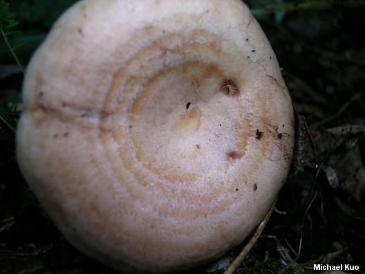Lactarius chrysorrheus [ Basidiomycota > Russulales > Russulaceae > Lactarius . . . ] by Michael Kuo The North American version of the European species Lactarius chrysorrheus is mycorrhizal with oaks from the Great Plains eastward; it features a pale pinkish cap, gills that do not develop reddish spots and discolorations, and white milk that turns yellow when exposed to air. Its stem is not slimy, and its surface does not feature potholes. The smooth stem is a good way to separate Lactarius chrysorrheus from Lactarius maculatipes, which shares the preference for oaks and the yellowing milk but features yellowish potholes on the stem surface (and a nearly white cap). The similar Lactarius vinaceorufescens is mycorrhizal with conifers, usually has a redder cap, and has gills that develop reddish spots by maturity. If you are on the West Coast, see Lactarius xanthogalactus for the closest look-alike to Lactarius chrysorrheus. "Lactarius chrysorheus" (with one r) is a spelling used by some authors. Description: Ecology: Mycorrhizal with oaks and possibly other hardwoods; summer and fall; probably to be expected throughout the oak forests of eastern North America. Cap: 3-10 cm; broadly convex with an inrolled margin when young; becoming shallowly depressed or vase-shaped with an uplifted margin; moist or dry; smooth or finely roughened; pale pinkish to pale cinnamon; often with vague concentric zones of color, at least when young. Gills: Attached to the stem or beginning to run down it; close; whitish to pale yellowish; not bruising or discoloring, not developing reddish spots with maturity. Stem: 3-8 cm long; 1-2 cm thick; more or less equal; dry; without potholes; whitish. Flesh: White; firm; yellow when sliced. Milk: Copious; white, becoming quickly yellow on exposure to air. Odor and Taste: Odor not distinctive; taste acrid. Spore Print: Yellowish. Chemical Reactions: KOH on cap surface yellowish to pale olive. Microscopic Features: Spores 6-9 x 5.5-6.5 µ; broadly ellipsoid; ornamentation 0.5-1.0 µ high, as amyloid warts and ridges that form partial reticula. Pleuromacrocystidia to about 75 µ long; fusiform. Cheilomacrocystidia similar. Pileipellis an ixocutis. REFERENCES: Fries, 1838. (Saccardo, 1887; Coker, 1918; Kauffman, 1918; Hesler & Smith, 1979; Smith, Smith & Weber, 1979; Weber & Smith, 1985; Phillips, 1991/2005; Heilmann-Clausen et al., 1998; Metzler & Metzler, 1992; Barron, 1999; McNeil, 2006; Miller & Miller, 2006; Binion et al., 2008.) Herb. Kuo 10010408. This site contains no information about the edibility or toxicity of mushrooms. |