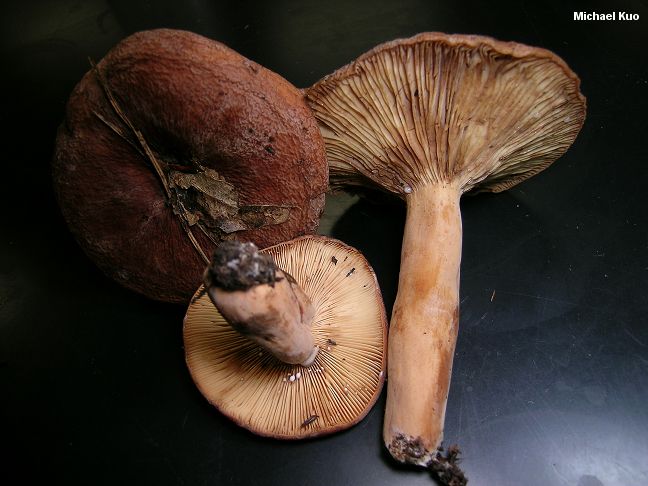 Lactarius corrugis [ Agaricomycetes > Russulales > Russulaceae > Lactarius . . . ] by Michael Kuo Funky and fairly easily recognized, Lactarius corrugis associates with oaks in eastern North America. When young, it has a cap that often appears coated with a very thin layer of whitish to grayish felt. At maturity, however, the coating has largely disappeared and the cap surface is often prominently corrugated. The copious white milk stains the gills and flesh slowly brown. Lactarius corrugis is similar to Lactarius volemus, but has a darker, redder cap, along with a darker stem and darker gills. Description: Ecology: Mycorrhizal with oaks and perhaps with other hardwoods; growing alone, scattered, or gregariously; summer and fall; widely distributed in eastern North America, and extending into Texas and Mexico. Cap: 4-20 cm; at first convex; becoming shallowly depressed; notably velvety; when young often appearing coated with a thin, grayish to whitish, feltlike material; in maturity often becoming deeply wrinkled and corrugated; usually dark brownish red to dark brick red but sometimes purplish brown or dark brown. Gills: Attached to the stem or beginning to run down it; close; pale buff when young but soon orangish to yellowish or brownish; discoloring brown where injured. Stem: 3-11 cm long; 1.5-3 cm thick; colored more or less like the cap, or paler; equal; when young with a feltlike coating like that on the cap; solid. Flesh: Whitish to yellowish; staining slowly brown when sliced. Milk: White; copious; unchanging when exposed to air; staining tissues brown; staining white paper brown. Odor and Taste: Odor not distinctive, or sometimes slightly fishy; taste mild. Chemical Reactions: KOH olive to brown on cap surface. Spore Print: White. Microscopic Features: Spores 9-13 x 8.5-12 µ; globose or subglobose; ornamentation 0.4-0.7 µ high, as widely spaced amyloid ridges forming partial to completed reticula. Pleuromacrocystidia conspicuous and abundant; subcylindric to subfusiform; thick-walled; arising in the subhymenium or gill trama; to 200 x 15 µ. Cheilocystidia similar but shorter. Pileipellis a lamprotrichoderm with a turf of cylindric to narrowly fusiform pileocystidia measuring up to about 125 x 6 µ. REFERENCES: Peck, 1880. (Saccardo, 1887; Coker, 1918; Kauffman, 1918; Hesler & Smith, 1979; Smith, Smith & Weber, 1979; Weber & Smith, 1985; Phillips, 1991/2005; Lincoff, 1992; Metzler & Metzler, 1992; Montoya & Bandala, 1996b; Barron, 1999; Roody, 2003; McNeil, 2006; Miller & Miller, 2006; Binion et al., 2008.) Herb. Kuo 08270210, 07210802. This site contains no information about the edibility or toxicity of mushrooms. |