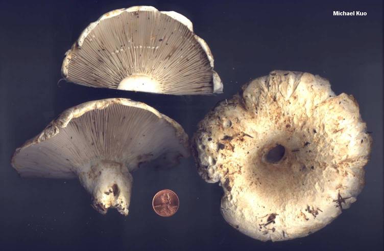 Lactarius deceptivus [ Agaricomycetes > Russulales > Russulaceae > Lactarius . . . ] by Michael Kuo In northern Michigan, Lactarius deceptivus is one of the most prolific late-summer mushrooms. It can reach astounding sizes, and often fruits in great numbers. Initially white, it is soon off-white with light brownish discolorations, and distinctively roughened or even scaly. Other distinguishing features include the gills, which are close or almost distant, but not densely crowded like the gills in Lactarius piperatus. The cap margin is inrolled at first, and is very softly leathery, like kid leather. In age the margin is typically still folded under just a little bit, and still soft. However, the cap and stem are not finely velvety overall, as they are in Lactarius subvellereus var. subdistans. Lactarius deceptivus has a white spore print and a very acrid taste. Its milk--the presence of which distinguishes it quickly from superficially similar Russula species like Russula brevipes, which frequently grows alongside it--is white, and stains the gills brownish. Lactarius tomentoso-marginatus, described by Hesler & Smith (1979) as similar to Lactarius deceptivus but with gills that become pinkish and are discolored pale cinnamon by the milk and, under the microscope, spores with lower ornamentation (to about 0.5 µ), has been synonymized by Montoya & Bandala (2005), who found the normal variation within Lactarius deceptivus to account for the putative differences. Description: Ecology: Mycorrhizal with conifers and hardwoods (epsecially oaks); growing scattered or densely gregariously; summer and fall; widely distributed east of the Rocky Mountains; also present in Mexico and Costa Rica; common. Cap: 8-16 (-30!) cm; at first convex with a central depression; becoming flat, with a shallow central depression, or vase-shaped at maturity; at first bald, but soon roughening, becoming torn into patches or scales; dry; the margin soft and cottony, inrolled at first--eventually even or slightly inrolled, but still soft; white at first, soon discoloring tan and brownish. Gills: Attached to the stem or beginning to run down it; close or nearly distant; occasionally forking; whitish or pale yellowish, becoming cream colored and finally dingy tan; usually staining and discoloring brownish. Stem: 3-9 cm long; 1-4 cm thick; whitish, discoloring brownish or tan; hard; dry; smooth or sometimes developing scales; without potholes; more or less equal, or tapering to base. Flesh: Firm in cap; white; unchanging when sliced. Milk: White; unchanging; sometimes staining brownish. Odor and Taste: Odor mild or pungent at maturity; taste strongly acrid. Spore Print: White to buff. Chemical Reactions: Cap surface reddish with KOH. Microscopic Features: Spores 9-13 x 7-9 µ; broadly ellipsoid; ornamentation 0.5-1.5 µ high, as isolated amyloid warts. Pleuromacrocystidia subclavate to subventricose or fusiform; abundant; to about 100 µ long. Cheilomacrocystidia similar, but shorter. Pileipellis not clearly differentiated from pileus trama. REFERENCES: Peck, 1885. (Saccardo, 1887; Coker, 1918; Kauffman, 1918; Hesler & Smith, 1979; Smith, Smith & Weber, 1979; Phillips, 1991/2005; Lincoff, 1992; Montoya & Bandala, 1996; Roody, 2003; Montoya & Bandala, 2005; McNeil, 2006; Miller & Miller, 2006; Kuo, 2007; Binion et al., 2008.) Herb. Kuo 09029508, 09030204. This site contains no information about the edibility or toxicity of mushrooms. |