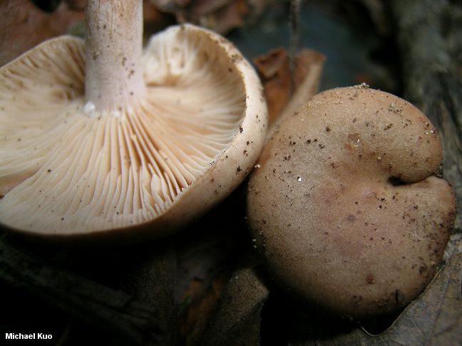 Lactarius imperceptus [ Agaricomycetes > Russulales > Russulaceae > Lactarius . . . ] by Michael Kuo Found under oaks in eastern North America, Lactarius imperceptus is a brownish species with white milk that turns yellow when exposed to air . . . in theory. In practice the cap is sometimes rather pinkish, and the yellowing of the milk may be faint (even absent) and/or slow to develop. The cap is never zoned, helping to separate it from other oak-loving species with yellowing milk, like Lactarius chrysorrheus. Description: Ecology: Mycorrhizal with oaks (especially southern live oaks) and possibly with other hardwoods; summer and fall; widely distributed east of the Great Plains. Cap: 2.5-9 cm; convex, with an incurved margin when young, becoming flat or shallowly depressed, often with a central bump; dry or moist; bald; dull brown to tan, cinnamon tan, pinkish brown, or paler; consistently without zones of color or texture. Gills: Attached to the stem or beginning to run down it; close; whitish to pinkish or very pale tan; often developing cinnamon to reddish brown stains and discolorations. Stem: 2.5-9 cm long; up to about 1.5 cm thick; more or less equal; dry or moist; without potholes; smooth; pale at first, becoming colored like the cap. Flesh: Thin; pale, becoming pinkish; not changing when sliced, or turning slowly yellowish to yellow. Milk: Creamy; turning slightly to substantially yellowish (often very slowly) or not yellowing appreciably; not staining tissues, or staining them yellowish; staining white paper yellow. Odor and Taste: Odor not distinctive; taste usually acrid but sometimes weakly so. Spore Print: White to yellowish. Microscopic Features: Spores 7-9.5 x 6-8 µ; broadly ellipsoid; ornamentation 0.5-1.5 µ high, as amyloid warts and ridges that form broken reticula or remain scattered. Pleuromacrocystidia to about 70 x 10 µ; fusiform to fusoid-mucronate or subcylindric, often with an apical constriction. Cheilomacrocystidia similar but shorter. Pileipellis an ixolattice or ixotrichoderm, with the gelatinous material quickly dissolving in KOH mounts. REFERENCES: Beardslee & Burlingham, 1940. (Hesler & Smith, 1979; Phillips, 1991/2005; Binion et al., 2008.) Herb. Kuo 10110904. This site contains no information about the edibility or toxicity of mushrooms. |