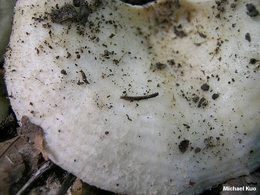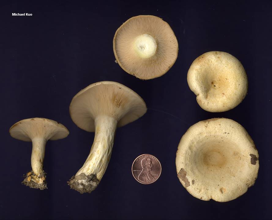 The features defining this species include the fact that the white milk quickly turns yellow when exposed to air, the pale yellowish cap, the pale gills (which may bruise tan but do not develop reddish stains or change color substantially in age), and the stem, which is somewhat slimy when the mushroom is fresh and young. Lactarius maculatipes is found under oaks; it is probably fairly widely distributed east of the Rocky Mountains (see below). The principal competitors for your identification attention are Lactarius chrysorrheus and Lactarius vinaceorufescens, which lack the slimy stem; see the comments below for help separating them from Lactarius maculatipes.