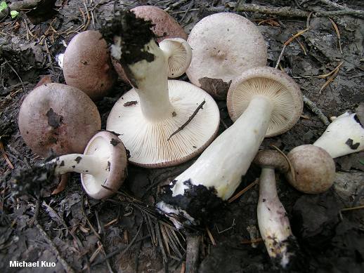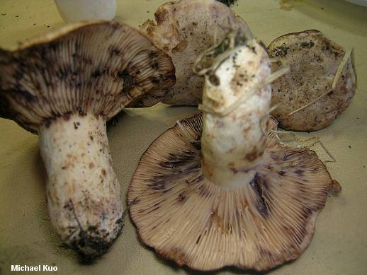 Lactarius montanus [ Agaricomycetes > Russulales > Russulaceae > Lactarius . . . ] by Michael Kuo This mushroom is the western North American version of the eastern Lactarius uvidus. It associates with conifers and willows in wet montane ecosystems, and features a stockier stem and a drier cap surface than the eastern North American species. Like its eastern counterpart it has a cap that turns green when a drop of KOH is applied, and copious white milk that stains tissues lilac purple. Lactarius uvidus var. montanus is a former name. Description: Ecology: Mycorrhizal with conifers and with willows, in wet montane ecosystems; summer and fall; Rocky Mountains, Cascade Mountains, and the Sierra Nevada. Cap: 3-11 cm; convex with an incurved margin when young, becoming flat or shallowly depressed; sticky when very fresh but soon dry; bald; finely rugged; brownish lilac to lilac brown or brownish purple or purplish gray; without concentric zones of color, or occasionally with faint zones. Gills: Broadly attached to the stem or beginning to run down it; close; whitish to creamy; stained lilac to purple (eventually brownish) by the milk where damaged. Stem: 3-10 cm long; 1-3 cm thick; club-shaped, becoming more or less equal with maturity; dry or slightly sticky when fresh; without potholes; whitish to purplish buff; often stained yellow in places, especially near the base; bruising and discoloring lilac to purple. Flesh: White; staining lilac when sliced. Milk: White; copious; staining tissues lilac to purple. Odor and Taste: Odor fragrant or not distinctive; taste not distinctive, or faintly resinous. Spore Print: Yellowish. Chemical Reactions: KOH green on cap surface. Microscopic Features: Spores 8-12 x 6-9 µ; broadly ellipsoid; ornamentation mostly under 0.5 µ high; connectors sometimes forming partial reticula. Macropleurocystidia up to about REFERENCES: (Hesler & Smith, 1979) Montoya & Bandala, 2003. (States, 1990; Evenson, 1997; Methven, 1997.) Herb. Kuo 08160708. Herb. DBG: RMNP 2008-055, 2008-056, 2008-059, 2008-067. This site contains no information about the edibility or toxicity of mushrooms. |
