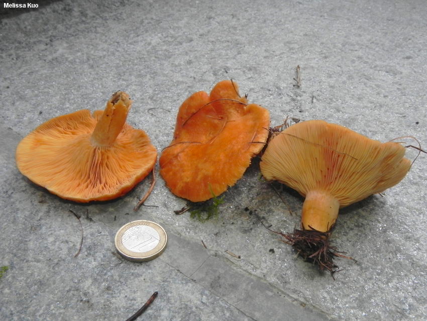 Lactarius porninsis [ Basidiomycota > Russulales > Russulaceae > Lactarius . . . ] by Michael Kuo Lactarius porninsis is an Alpine and Carpathian species strictly associated with European larch. In some ways it is a bit unremarkable; it is yet another medium-sized, orange milky cap, and it lacks most of the distinguishing features found in similar species (no pot-holes on the stem, no dramatic green staining, no excruciatingly acrid taste, no colored latex). But it is associated with one of the world's more beautiful trees and finding it in the fall means you are surrounded by the gorgeous yellow and dull orange hues of the larches as their needles begin to fall, contrasting with the deep greens of the non-deciduous spruces—all set against the snow-topped mountains. Description: Ecology: Mycorrhizal with European larch; growing alone, scattered, or gregariously; summer and fall; found throughout the range of the host tree (the Alps and the Carpathians) and, reportedly, where European larch is planted as an ornamental or has been introduced. The illustrated and described collection is from northwest Italy, about 50 miles (as the crow flies) from the type locality near Chamonix, France. Cap: 4–8 cm; convex at first, becoming more or less flat, or shallowly depressed; sticky; bald; finely rugged; bright orange, becoming duller with age; not zoned, or zoned faintly toward the margin; the margin not lined. Gills: Broadly attached to the stem or beginning to run down it; close; short-gills frequent; pale orange. Stem: 2–4 cm long; 1–1.5 cm thick; slightly tapered to the base; without potholes; bald; pale orange; basal mycelium white. Flesh: Whitish to pale orange; unchanging when sliced. Milk: White; scant; unchanging when exposed to air. Odor and Taste: Not distinctive. Spore Print: Undocumented by me; reported as "cream" by Heilmann-Clausen et al. (2000) and illustrated as pale orange by Kränzlin (2005). Microscopic Features: Spores 8–11 x 7–8 µm; ellipsoid; ornamented with amyloid warts and ridges extending up to about 0.5 µm high; connectors fairly frequent, forming wide-meshed, partially reticulate patterns. Macrocystidia narrowly fusiform; to about 50 x 7.5 µm. Lactifers very abundant in hymenial trama. Pileipellis an ixocutis; elements 2.5–5 µm wide. REFERENCES: Rolland, 1889. (Saccardo, 1891; Heilmann-Clausen et al., 2000; Kränzlin, 2005; Verbeken & Vesterholt, 2008.) Herb. Kuo 10141413. This site contains no information about the edibility or toxicity of mushrooms. |