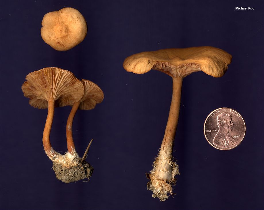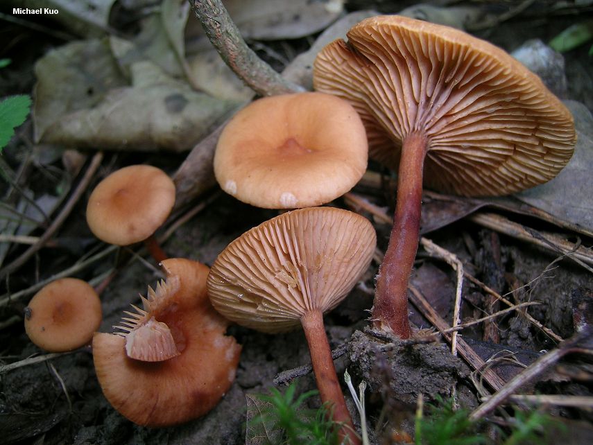Lactarius subserifluus [ Agaricomycetes > Russulales > Russulaceae > Lactarius . . . ] by Michael Kuo Here is one of the few smallish, burnt-orange species of Lactarius that can be identified, at least tentatively, without recourse to microscopic examination. The stem of Lactarius subserifluus is what sets it apart; unlike the hollowing, brittle-fleshed, wimpy stems of most similar species, the long and skinny stem of this mushroom is tough and pliant, and rather non-Lactarius-ish--and its base is covered with strigose, orange to whitish hairs. Distinguishing microscopic features include round, reticulate spores and the absence of macrocystidia. Lactarius subserifluus is associated with oaks in eastern North America. Lactarius strigosipes is a similar species described from Mexico (Montoya & Bandala, 2008), associated with hornbeam . It features close, thin gills as well as an intense "spicy" odor and, under the microscope, nests of sphaerocysts throughout the cap and stem trama. Description: Ecology: Mycorrhizal with oaks, primarily in oak-hickory woods; growing alone, scattered, or gregariously; June, July, and August; probably widely distributed east of the Great Plains. Cap: 2-7 cm; planoconvex developing a central depression and, at the center, a sharp bump; moist or dry; bald; brownish orange to rusty orange. Gills: Running down the stem; well spaced; creamy to pale yellowish at first, developing cinnamon spots and eventually discoloring cinnamon. Stem: 5-12 cm long; 3-7 mm thick; tough and flexible; more or less equal; bald; without potholes; cinnamon to rusty brown; dry; base covered with stiff orange to whitish hairs. Flesh: Pale brownish to pale cinnamon; not staining when sliced. Milk: Watery; not staining tissues, or staining the gills cinnamon; not staining white paper. Odor and Taste: Odor not distinctive, or fragrant; taste mild or slightly peppery. Spore Print: Pale yellowish. Chemical Reactions: Cap surface olive with KOH. Microscopic Features: Spores 6-7.5 x 6-7 µ; subglobose; ornamentation 1.0-1.5 µ high, as amyloid warts and ridges that form partial to nearly complete reticula. Macrocystidia absent. Pileipellis a hyphoepithelium. Nests of sphaerocysts not present in cap and stem trama. REFERENCES: Longyear, 1902. (Hesler & Smith, 1979; Smith, Smith & Weber, 1979.) Herb. Kuo 08270217, 07220312, 06280807. This site contains no information about the edibility or toxicity of mushrooms. |