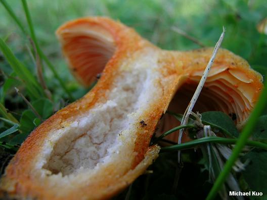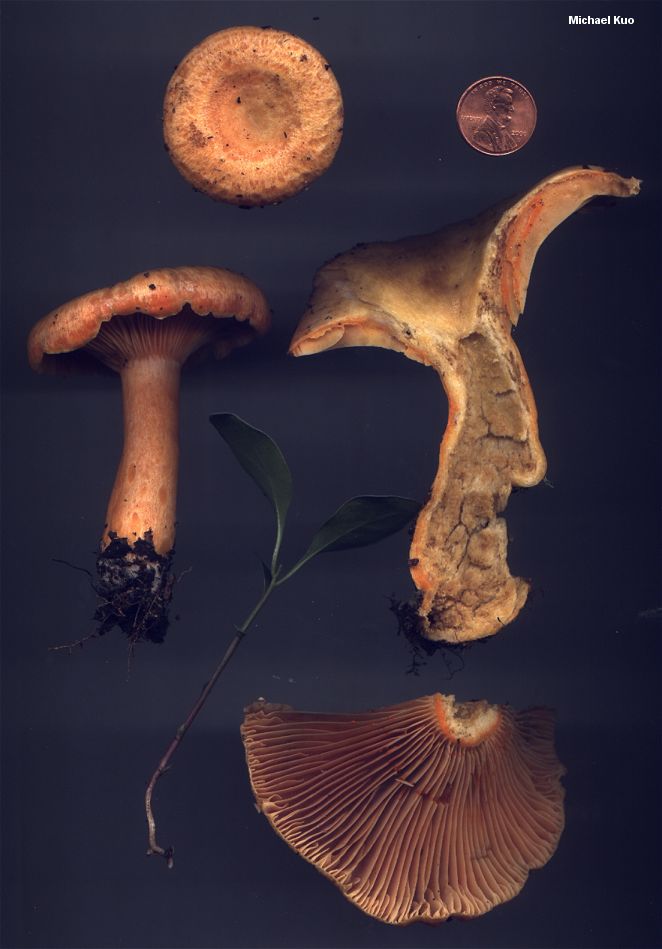 Lactarius thyinos [ Agaricomycetes > Russulales > Russulaceae > Lactarius . . . ] by Michael Kuo What a beautiful mushroom! Lactarius thyinos is found in cedar bogs in the northeastern U.S. and in Canada. It is easily identified: it is the only species of Lactarius that has orange milk and does not bruise green. It is often found growing alongside Lactarius deliciosus var. deterrimus, which also has orange milk and can look similar. Simply handling the two mushrooms will differentiate them, however; Lactarius deliciosus readily bruises green on all parts. Description: Ecology: Mycorrhizal with conifers, usually with northern white cedar; growing scattered or gregariously; summer and fall; northeastern North America and the upper Great Lakes region. Cap: 3-9 cm; at first convex, becoming flat, with a shallow central depression, or vase-shaped; slimy or thinly slimy when fresh; the margin arched; bald; zoned with concentric bands of carrot orange and paler orange. Gills: Attached to the stem or running slightly down it; close or nearly distant; orange; bruising brownish. Stem: 4-8 cm long; 1.5-2 cm thick; orange; more or less equal, or tapering somewhat to base; bald; hollow; sometimes slimy when young; often with a whitish sheen above; sometimes bruising dull red or brownish; sometimes with wide, shallow potholes. Flesh: Thin; white to orangish. Milk: Orange; unchanging when exposed; slowly staining tissues red. Odor and Taste: Odor faintly fragrant; taste mild. Chemical Reactions: KOH negative on cap surface. Spore Print: Whitish to pale yellow. Microscopic Features: Spores 9-12 x 7.5-9 µ; broadly ellipsoid to subglobose; ornamentation 0.5-1.0 µ high, as amyloid warts and ridges forming partial reticula. Pleuromacrocystidia scattered to abundant; subfusoid to subcylindric; to about 100 x 10 µ. Cheilocystidia fusoid; to about 60 x 10 µ. Pileipellis an ixocutis. REFERENCES: A. H. Smith, 1960. (Hesler & Smith, 1979; Smith, Smith & Weber, 1979; Arora, 1986; Phillips, 1991/2005; Barron, 1999; McNeil, 2006; Nuytinck et al., 2006; Kuo, 2007.) Herb. Kuo 09029403, 09050201. This site contains no information about the edibility or toxicity of mushrooms. |