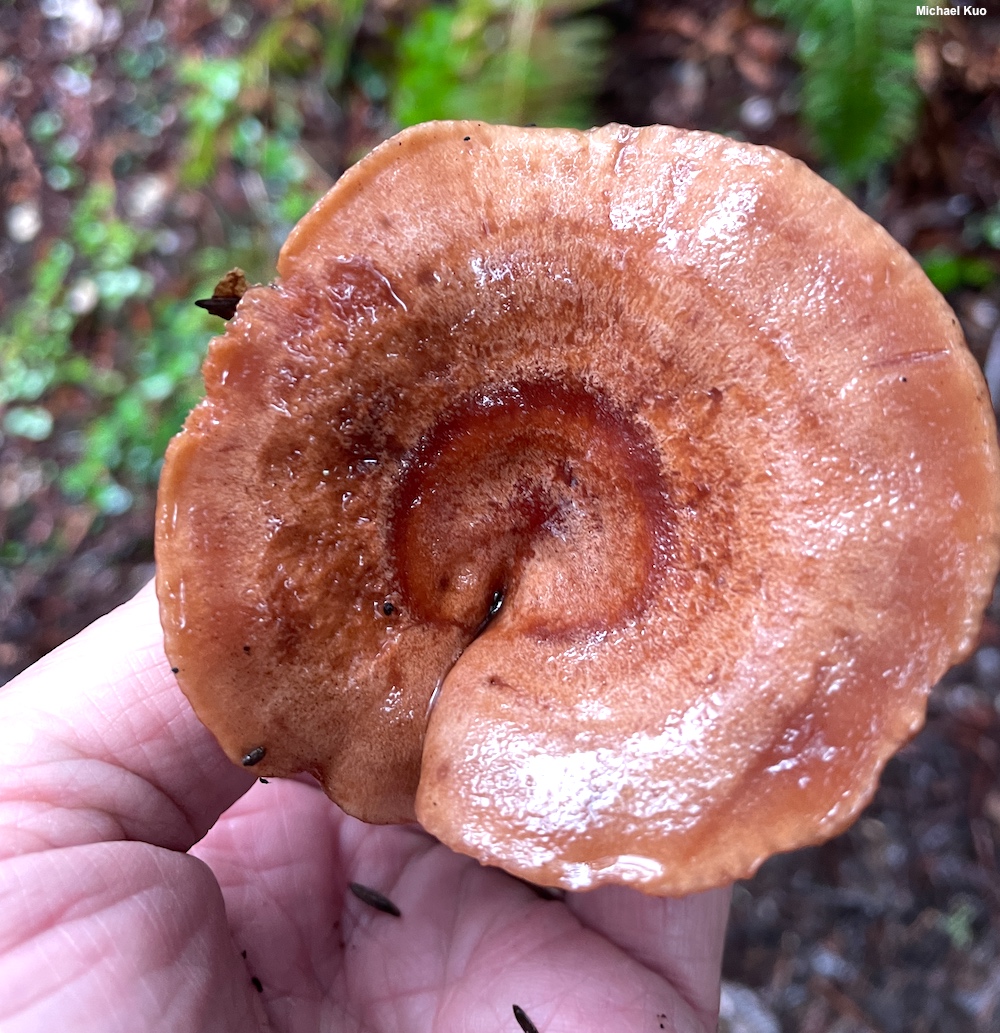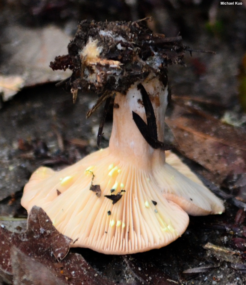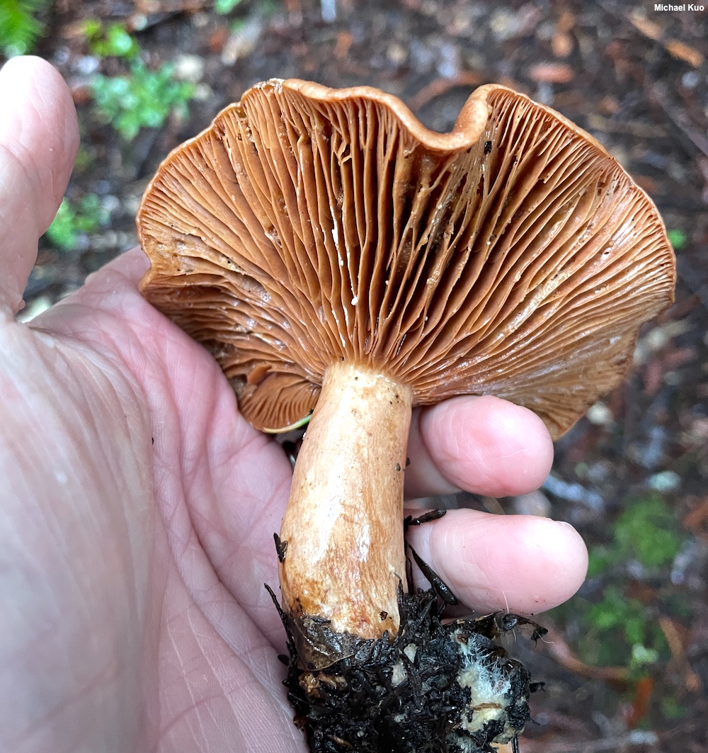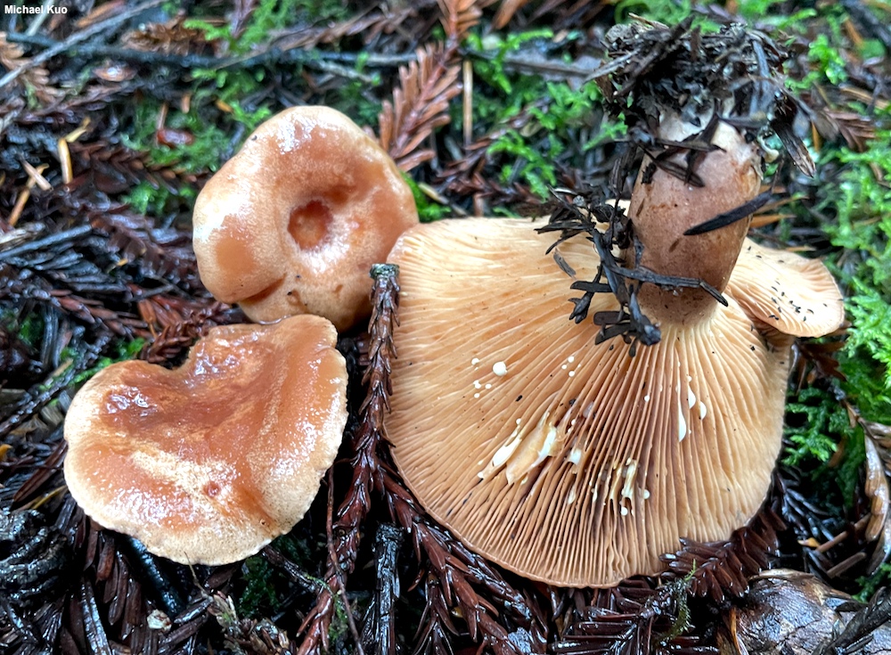 [ Basidiomycota > Russulales > Russulaceae > Lactarius . . . ] Lactarius xanthogalactus by Michael Kuo, 31 January 2024 This West-Coast milky cap is found in coastal forests, usually in association with coast live oak. Defining features include the faintly zoned, reddish brown to orangish brown cap, the lack of potholes on the stem surface and, especially, the milk, which is white as exuded but quickly turns yellow when exposed to air. Lactarius alnicola is a similar species found in the same coastal forests as Lactarius xanthogalactus; however, the milk of Lactarius alnicola turns only slightly yellow (if at all), its taste is quickly and excuciatingly acrid, and its stem usually features at least some potholes. In eastern North America, Lactarius vinaceorufescens is a similar species associated with eastern white pine. Description: Ecology: Mycorrhizal with coast live oak, and possibly with Douglas-fir (Horton et al. 1999); growing alone or gregariously; fall and winter; originally described from the Stanford University campus; distributed primarily in coastal California. The illustrated and described collections are from Santa Cruz and San Mateo counties. Cap: 5–12 cm; convex with an incurved margin when young, becoming shallowly vase-shaped, with the margin uplifted; sticky when young, but soon merely moist, or dry; bald; orangish brown to reddish brown, often with vague concentric zones of color. Gills: Beginning to run down the stem; close; short-gills frequent; pale yellowish at first, becoming orangish to dull brownish orange. Stem: 2–7 cm long; 1–1.5 cm thick; equal; bald; without potholes; colored like the cap; hollowing with age; basal mycelium white to yellowish. Flesh: White; stained yellow by the milk when sliced. Milk: White as exuded but quickly yellow. Odor and Taste: Odor not distinctive; taste not distinctive, or faintly acrid. Microscopic Features: Spores 6–8 x 5–7 µm; ellipsoid; ornamentation consisting of amyloid ridges and warts under 0.5 µm high, forming partial reticula. Hymenial macrocystidia 45–70 x 7–11 µm; fusiform, occasionally with an apical constriction and a knob; smooth; thin-walled; hyaline in KOH. Pileipellis an ixocutis. REFERENCES: C. H. Peck, 1907. (Hesler & Smith, 1979; Methven, 1997; Horton et al., 1999; Redecker et al., 2001; Bessette et al., 2009; Desjardin, Wood & Stevens, 2015; Siegel & Schwarz, 2016.) Herb. Kuo 01122404. This site contains no information about the edibility or toxicity of mushrooms. |
