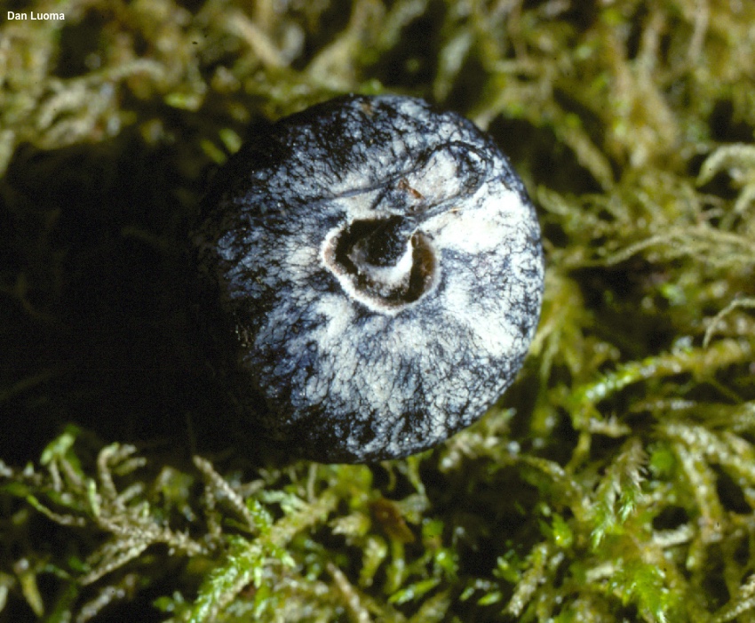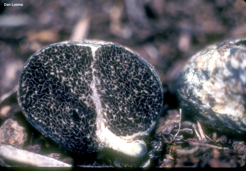 Leccinum caespitosum [ Basidiomycota > Boletales > Boletaceae > Leccinum . . . ] by Michael Kuo Among the many truffle-like, sequestrate mushrooms found in western North America, this species can be recognized by the presence of a "columella" (central tissue forming a stem that never—or barely—happened); the brown color of the mature spore mass; the blue bruising of the outer tissues and the columella; and, under the microscope, the longitudinally ribbed spores. Additionally, there is a stubby pseudostem created by the columella, and the outer surface is initially whitish before it becomes stained blue. Believe it or not, this mushroom, formerly known as Chamonixia caespitosa, is a species of Leccinum, according to its DNA. Results from a series of studies over the last decades support the idea that several genera of truffle-like, sequestrate mushrooms—Chamonixia, Octaviania, Rossbeevera, and Turmalinea—are best treated as Leccinum species. Although these genera represent distinct groups within Leccinum, they are "nested" inside the bolete-like Leccinum species, leaving taxonomy with a choice: do we keep the "old" genus names for the truffles and, out of necessity, create a bunch of other new genus names for the boletes (because you can't have a genus that exists within another genus!) . . . or do we lump everything together and, by rule, use the oldest genus name in the group, which is Leccinum? The funky names for funky mushrooms are admittedly cool—especially Chamonixia, named for the proximity of the original type collection to Chamonix, on the slopes of Mt. Blanc in France. But having cool names is not as important as reflecting evolution, which is the point of taxonomy, and "use of the genus name Leccinum for sequestrate leccinoid fungi provides instant recognition of the shared evolutionary history in a way that is accessible to nonspecialists and the general public; this evolutionary story is lost when obscured by a proliferation of genus names" (Kuo & Ortiz-Santana 2020). Description: Ecology: Mycorrhizal with conifers (especially hemlocks, Douglas-fir, spruces, and firs); growing alone or gregariously, usually partially submerged in the soil or completely underground; spring through fall; montane western North America, the Appalachian Mountains, and the European Alps. Fruiting Body: 1.5–3 cm across; round or nearly so; outer surface whitish at first, bald or a little silky, bruising blue and eventually becoming brown overall; pseudostem present as a tiny, stublike extension; interior composed of oblong chambers that are initially whitish but turn dark brown with maturity; columella extending well into the interior from the pseudostem. Odor: Not distinctive. Microscopic Features: Spores 18–22 x 13–15 µm; oval, with a short appendage (a portion of the sterigmatum); widely longitudinally ribbed; reddish brown in KOH. REFERENCES: Rolland, 1899. (Saccardo, 1902; Smith & Singer, 1959; Breitenbach & Kränzlin, 1986; Trappe, Evans & Trappe, 2007; Læssøe & Petersen, 2019; Kuo & Ortiz-Santana, 2020.) I have not collected or studied this mushroom; the description is based on the sources cited. This site contains no information about the edibility or toxicity of mushrooms. |