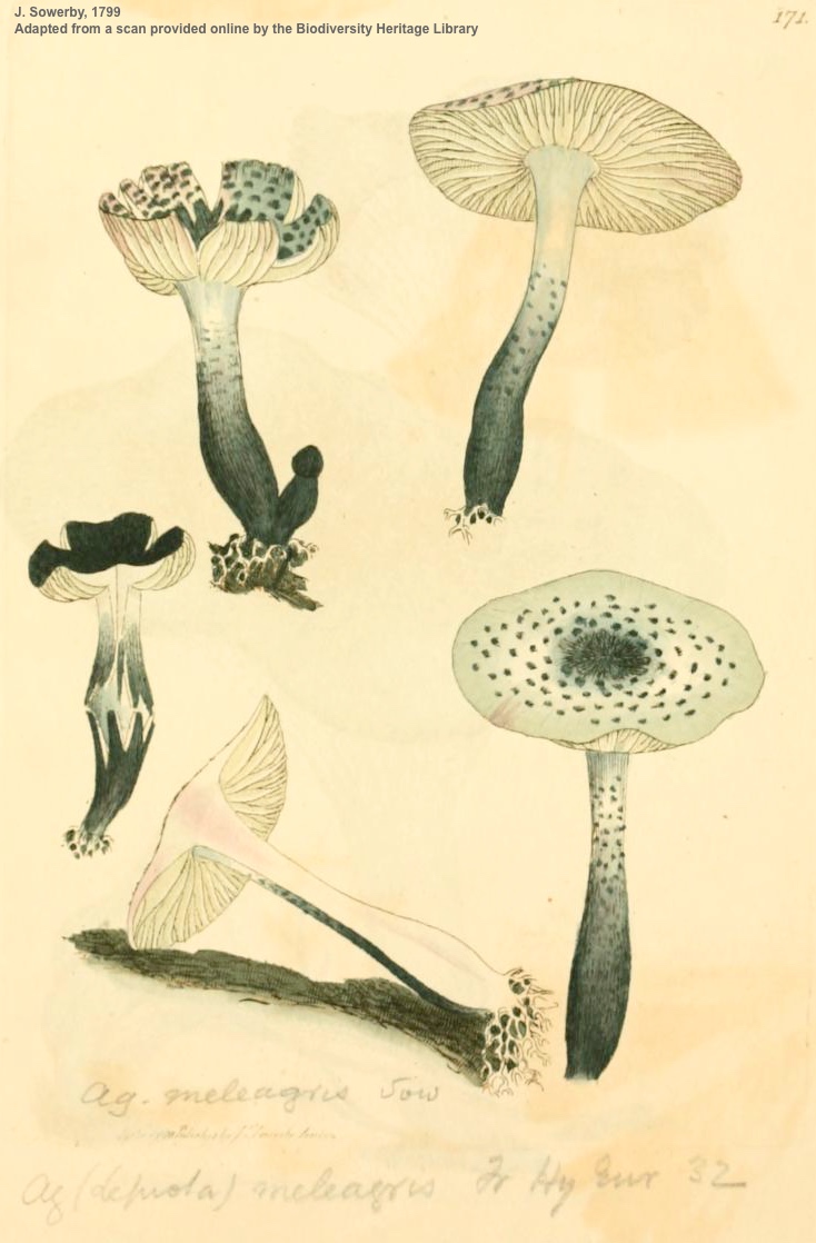 [ Basidiomycota > Agaricales > Agaricaceae > Leucoagaricus . . . ] Leucoagaricus meleagris by Michael Kuo, 3 June 2024 Leucoagaricus meleagris, also known as "Lady Arden's hot-bed guinea hen" (hang on; I'll get to that), is an uncommon lepiotoid mushroom that appears in woodchips and compost beds, growing in tightly-packed clusters. The caps have dark brown centers and, elsewhere, fine brown scales over a whitish ground color; the gills are free from the stem and become pale yellow with development; the stems are finely fibrillose-scaly and occasionally feature a brown-edged, collapsed ring. The flesh turns lemon yellow, then slowly reddish, when sliced, at least in the stem apex. Leucoagaricus americanus is very similar, and is often found in woodchip beds—but it is a larger, stockier species, and it does not tend to grow in clusters (additionally, under the microscope, its spores have a more discernible pore and the terminal cells of its pileipellis tend to be more pointed, rather than bluntly rounded). Sowerby's original description of Agaricus meleagris (1799) is very brief, and begins with: "I am obliged to Lady Arden for beautiful specimens of this Agaric found in an hot-bed, May 24th, 1798. I have named it A. meleagris." Since the epithet meleagris is Greek for "guinea hen" (μελεαγρις), the best common name for this fungus is clearly, as I said above, "Lady Arden's hot-bed guinea hen." Why Sowerby thought the mushroom looked like a guinea hen is unclear, but he used an illustration of the species, which appears to the right, as a substitute for a thorough textual description—kind of like when I get lazy and write "see photos" instead of writing out the details of a mushroom collection. Lepiota meleagris and Leucocoprinus meleagris are synonyms. According to Vellinga (2000) Lepiota sanguiflua, described from Florida by Murrill (1945) is likely the same species. Description: Ecology: Saprobic, growing in clusters and gregariously in woodchips or compost; summer and fall; originally described from England (Sowerby 1799); widely distributed but uncommon in Europe and North America; also reported from Asia, Oceania, and South America. The illustrated and described collections are from Ohio. Cap: 2.5–9 cm across; broadly convex to broadly bell-shaped or nearly flat; dry; brown and bald over the center; mid-zone with fine brown scales over a whitish ground; marginal area with only a few scales, becoming finely lined for about 5 mm; sometimes bruising yellowish, then reddish after up to 24 hours. Gills: Free from the stem; close or crowded; short-gills frequent; whitish at first, becoming pale lemon yellow; bruising slowly brownish. Stem: 6.5–15 cm long; 4–8 mm thick at the midpoint; narrowly spindle-shaped, with a tapered base that sometimes roots into the substrate; without a ring, or with an ephemeral, collapsing, brown-edged ring; white and bald above; below with fine brown fibrils and scales; basal mycelium white. Flesh: White; changing to yellow, then slowly red when sliced, at least in the stem apex. Odor: Not distinctive. Chemical Reactions: KOH dark pink on cap surface. Dried Specimens: Herbarium specimens feature rose pink caps for about a year before becoming brown. Spore Print: White. Microscopic Features: Spores 7–12 x 5–7 µm; broadly ellipsoid; with a very tiny pore that is not always visible; smooth; walls 1 µm thick; hyaline in KOH; inamyloid; at least some spores moderately dextrinoid. Basidia 25–28 x 9–12 µm; abruptly clavate; 4-sterigmate or occasionally 2-sterigmate. Pleurocystidia not found. Cheilocystidia 30–70 x 10–18 µm; clavate to fusiform or lageniform; often irregularly mucronate; smooth; thin-walled; hyaline in KOH. Pileipellis a cutis with aggregations of upright elements; elements 4–12 µm wide, smooth, hyaline to brownish in KOH; apex of most terminal cells bluntly rounded rather than acute. Clamp connections not found. REFERENCES: (J. Sowerby, 1799) R. Singer, 1951. (Kauffman, 1924; Smith & Weber, 1987; Vellinga, 2000; Vellinga, 2001; Hemmes & Desjardin, 2002; Vellinga, 2004; Vellinga, 2004b; Bougher, 2009; Buczacki et al., 2013; Lange, 2018; Kibby, 2020.) Herb. Kuo 09032201, 10082301. This site contains no information about the edibility or toxicity of mushrooms. |