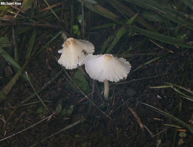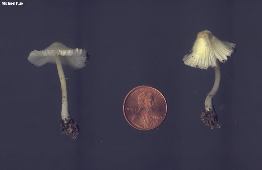 Leucocoprinus flavescens [ Basidiomycota > Agaricales > Agaricaceae > Leucocoprinus . . . ] by Michael Kuo Leucocoprinus flavescens is a tiny, pale yellow lepiotoid mushroom, similar to Leucocoprinus birnbaumii but with a paler cap that features a brownish center, and substantially smaller spores. The species was originally described by Morgan (1907) from an Ohio collection made under black locust and honey locust, and it has since been recorded from greenhouses in Massachusetts and California. I have made two collections in Illinois that appear to match Leucocoprinus flavescens: one in woods dominated by black locust and one in grass next to my house, under the drip of an air conditioner, with a large honey locust tree 30 feet away. Leucocoprinus flavescens may simply be a synonym of Leucocoprinus straminellus (better known by its former name, Leucocoprinus denudatus), but the latter mushroom has a yellow, rather than pale brown, cap center, and its spores are usually slightly larger. Lepiota flavescens is a synonym. Description: Ecology: Saprobic; growing alone or scattered in the vicinity of black locust or honey locust; also reported from greenhouses; summer; distribution uncertain. The illustrated and described collections are from Illinois. Cap: 1-2.5 cm; egg-shaped when young, becoming bell-shaped to broadly convex or nearly flat at maturity, but retaining a central bump; dry; grooved from the margin to the central "eye"; powdery or very finely scaly where grooved; bald over the center; light greenish yellow except for the brownish to tawny brown center. Gills: Free from the stem; close; short-gills infrequent; white with a yellowish cast, or yellowish. Stem: 20-60 mm long; 1-2 mm thick; more or less equal above, but with a swollen base; pale yellow; sometimes discoloring reddish brown; when fresh and young covered with tiny powdery scales, but soon bald; with a yellowish, bracelet-like ring on the upper stem that sometimes disappears; basal mycelium white. Flesh: Whitish to pale yellow; very thin. Odor and Taste: Odor not distinctive; taste bitter. Chemical Reactions: KOH negative on cap surface. Spore Print: White. Microscopic Features: Spores 4-6.5 x 3.5-4.5 µ; ellipsoid to broadly ellipsoid or nearly subglobose; without a pore; smooth; thick-walled; hyaline in KOH; golden to tawny yellow in Melzer's. Cheilocystidia 35-50 x 7.5-10 µ; widely cylindric to clavate, subclavate, subutriform, or subfusiform; hyaline in KOH; thin-walled. Pleurocystidia not found. Pileipellis with inflated (10-35 µ), subglobose cells over the disc (young specimens) and scattered among the striae (often difficult to find). REFERENCES: (Morgan, 1907) H. V. Smith, 1981. (Smith & Rea, 1944; Kauffman, 1924; Smith, Smith & Weber, 1979; H. V. Smith, 1981; H. V. Smith & Weber, 1982.) Herb. Kuo 08050201, 08190501. This site contains no information about the edibility or toxicity of mushrooms. |