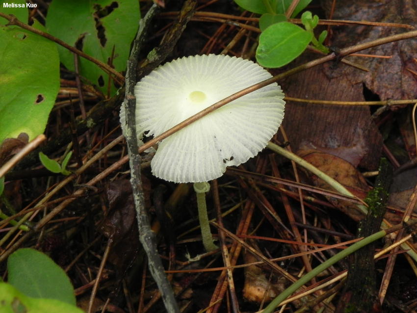 Leucocoprinus fragilissimus [ Basidiomycota > Agaricales > Agaricaceae > Leucocoprinus . . . ] by Michael Kuo This tiny lepiotoid mushroom is so exceedingly fragile that collecting it and preserving it for study presents a real challenge. The stem is quite long, proportionally, but so skinny that it breaks with the slightest pressure--and the cap begins to dissolve and collapse within a few hours of expanding. Leucocoprinus fragilissimus is found in southeastern North America, from Texas to Florida, Maryland, and southern Ohio. Its fragile stature, deeply grooved cap, pale yellow colors, and flimsy ring make it fairly easy to identify, but compare it with Leucocoprinus flavescens, which is a tad sturdier and features much smaller spores. Additionally, Helen Smith (1982) describes Leucocoprinus magnicystidiosus, from Texas, featuring brighter yellow colors and, more conclusively, large pleurocystidia. Description: Ecology: Saprobic; growing alone or scattered, in humus; summer; distributed in the southeastern United States, from Texas to the southern Appalachians; also reported from Costa Rica. The illustrated and described collection is from Ohio. Cap: 1.5-4.5 cm across; planoconvex, becoming nearly flat, with a small central bump; very fragile, and soon collapsing; deeply grooved from the margin to the center; dry or moist; pale greenish yellow, with a slightly darker center; fading to nearly white, with a yellowish center. Gills: Free from the stem; distant; pale yellow; often dissolving in hot weather. Stem: 4-9 cm long; 1-2 mm thick; equal above a small basal bulb; exceedingly fragile; bald; pale yellow, fading to nearly white; with a thin, fragile, yellow ring that sometimes disappears. Flesh: Insubstantial; yellowish. Odor: Not distinctive. Chemical Reactions: KOH negative on cap surface. Spore Print: White. Microscopic Features: Spores 9-12 x 7-8 µ; broadly ellipsoid; with a large (2 µ) pore at one end, creating a sublimoniform impression; smooth; hyaline in KOH; dextrinoid. Brachybasidioles abundant in young caps. Pleurocystidia absent. Cheilocystidia clavate; soon collapsing. Pileipellis cellular/hymeniform; terminal elements subglobose, 15-25 µ wide, hyaline in KOH. REFERENCES: (Ravenel in Berkeley & Curtis, 1853) Patouillard, 1900. (Saccardo, 1887; H. Smith & Weber, 1982; Smith & Weber, 1985; Metzler & Metzler, 1992.) Herb. Kuo 07281201. This site contains no information about the edibility or toxicity of mushrooms. |
