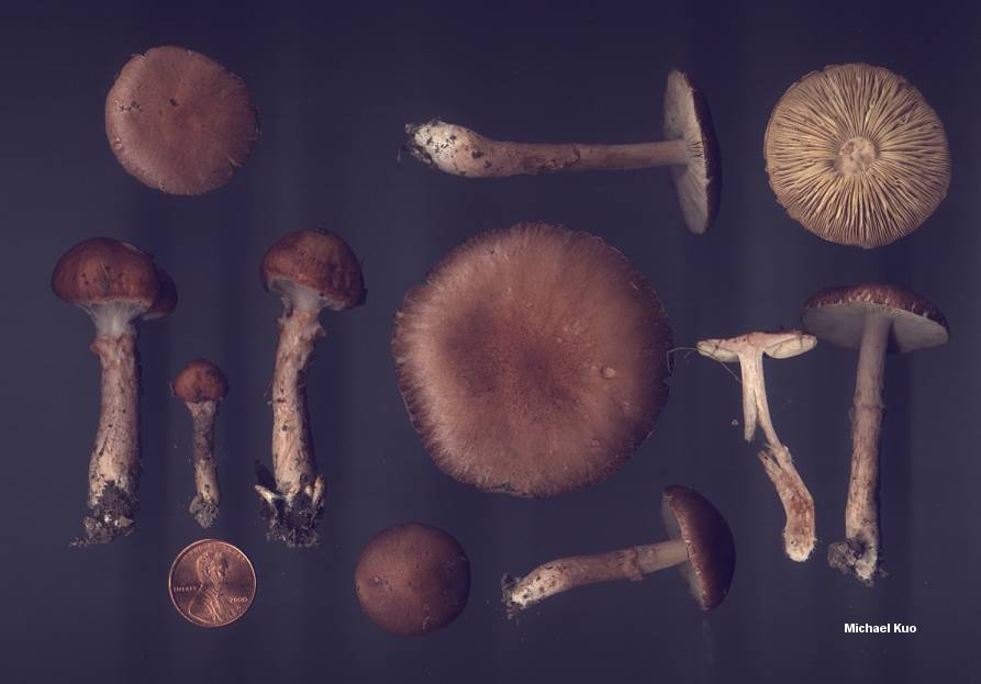 Limacella glioderma [ Basidiomycetes > Agaricales > (Amanitaceae/Pluteaceae) > Limacella ... ] by Michael Kuo I was thrilled to find the illustrated mushrooms under Red Pine in central Illinois . . . and then spent a year and a half trying to identify them. The specimens were dried out, though I didn't know it. Limacella had not crossed my radar screen before this, and I was relying on keys (my own included) that emphasize sliminess in order to arrive at the genus. Mycologist Andrew Methven took one look at the scan to the right, however, and put me on the right track--an illustration of several important points: