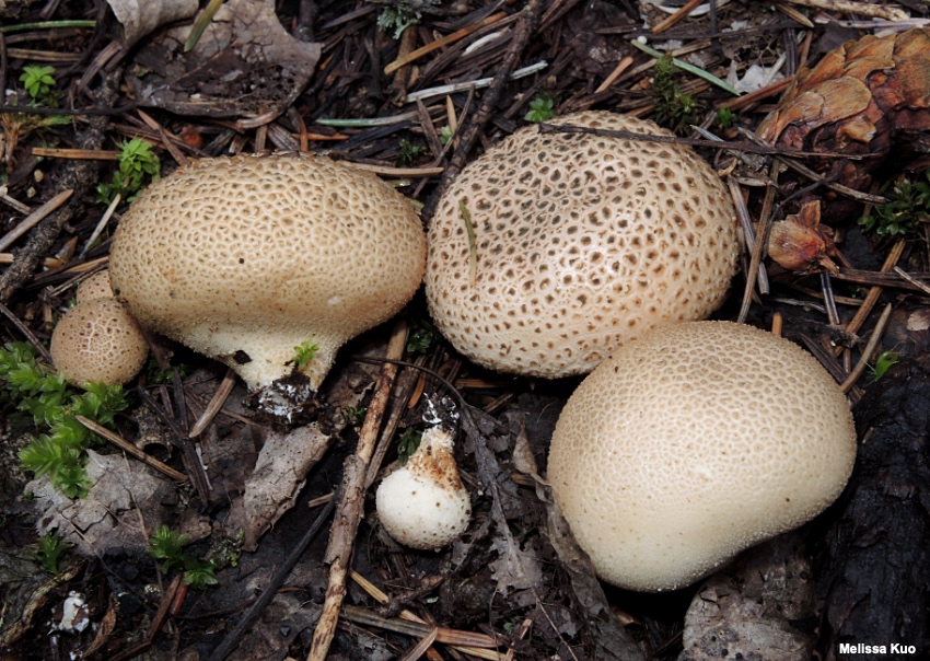 Lycoperdon subcretaceum [ Basidiomycota > Agaricales > Agaricaceae > Lycoperdon . . . ] by Michael Kuo Found under conifers in the mountains of western North America, Lycoperdon subcretaceum is a bit of a confusing puffball. To my eye it looks quite a bit like Scleroderma citrinum, since it develops warts and pyramid-shaped scales—but its interior is soft and white (turning to brown), not hard and black like the flesh of a Scleroderma. Lycoperdon subcreataceum has been tossed around from genus to genus; it was originally named Calvatia subcretacea by Zeller (1947), but it has since been placed in Gastropila and Handkea, as well. Most recently, DNA sequencing (see Bates 2004, Larsson & Jeppson 2010) supports placement of this species within Lycoperdon. Description: Ecology: Saprobic; usually growing alone or scattered; appearing in montane and subalpine conifer woods; summer and fall; distributed from the Rocky Mountains to the mountains of the West Coast. The illustrated and described collections are from Colorado. Fruiting Body: 2.5–4 cm high; 3–5 cm wide; round or nearly so above a small or nearly absent, pinched sterile base; dry; covered with low, fairly broad warts and scales that are mostly pyramid-shaped, with 3–5 angular edges; scales white at first but soon becoming brown or brown-centered and sometimes developing a small, soft, protruding spine in the center; surface elsewhere whitish to pale tan; skin thin; flesh white and soft at first, then turning brownish and eventually turning into brown spore dust; flesh in sterile base white becoming brownish; odor not distinctive. Microscopic Features: Spores 3–4.5 µ; subglobose; smooth or very finely verrucose; hyaline in KOH. Capillitial threads olive in KOH; 4–6 µm wide; thick-walled; smooth; with pores; fragmenting. REFERENCES: (Zeller, 1947) Jeppson & E. Larsson, 2010. (Zeller & Smith, 1964; Smith, 1975; Smith, Smith & Weber, 1981; Arora, 1986; Kreisel, 1989; Bates, 2004; Jarvis, 2014; Desjardin, Wood & Stevens, 2016.) Herb. Kuo 08131506. Herb DBG RMNP 2008-073, 2008-080. This website contains no information about the edibility or toxicity of mushrooms. |