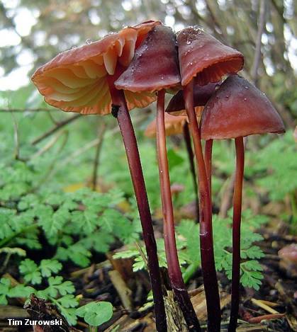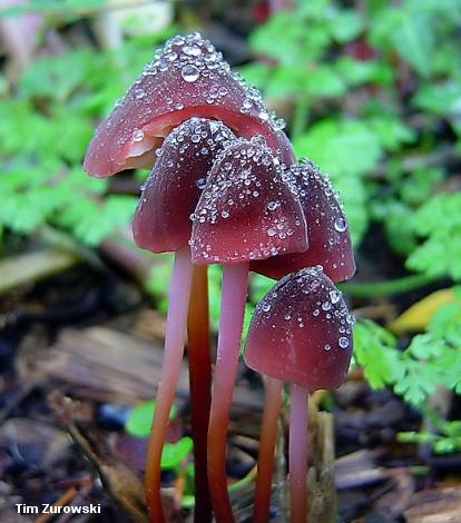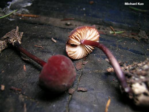 Marasmius plicatulus [ Basidiomycetes > Agaricales > Marasmiaceae > Marasmius . . . ] by Michael Kuo This beautiful West Coast mushroom is a decomposer of forest debris, found under conifers and hardwoods alike. Its cap and stem are purple-red when fresh (though less dramatic, browner specimens are not uncommon), and its well spaced gills are creamy. It is fairly large (for a Marasmius), and its finely velvety cap is often conical, making it seem more like a mycenoid mushroom. Under the microscope, however, it features funky "broom cells" on the cap surface and the edges of the gills, like many species of Marasmius. Description: Ecology: Saprobic on litter and debris under hardwoods or conifers; growing alone, scattered, or gregariously; fall and winter; along the West Coast. Cap: 1-5 cm; conical or bell-shaped when young, expanding to broadly conical or convex; dry; finely velvety, at least when fresh; sometimes developing radial wrinkles with age; purple-red to reddish brown. Gills: Narrowly attached to the stem or free from it; distant; white to creamy or yellowish; sometimes developing pinkish to brownish edges. Stem: 5-13 cm long; up to 3 mm thick; equal; dry; brittle; bald; creamy or pinkish above, purple-red to reddish black or dark brown below; basal mycelium white. Flesh: Thin; whitish. Odor and Taste: Taste mild; odor not distinctive. Spore Print: White. Microscopic Features: Spores 11-16.5 x 5-6.5 µ; smooth; fusoid, subfusoid, or amygdaliform; inamyloid. Pleurocystidia absent. Cheilocystidia cylindric with diverticulate apices ("broom cells"); to about 25 x 6 µ. Pileipellis hymeniform, with dextrinoid broom cells. Trama dextrinoid. REFERENCES: Peck, 1897. (Saccardo, 1899; Smith, Smith & Weber, 1979; Arora, 1986; Desjardin, 1987; Lincoff, 1992; Murphy, 2005; Miller & Miller, 2006.) Herb. Kuo 01131101. This site contains no information about the edibility or toxicity of mushrooms. |